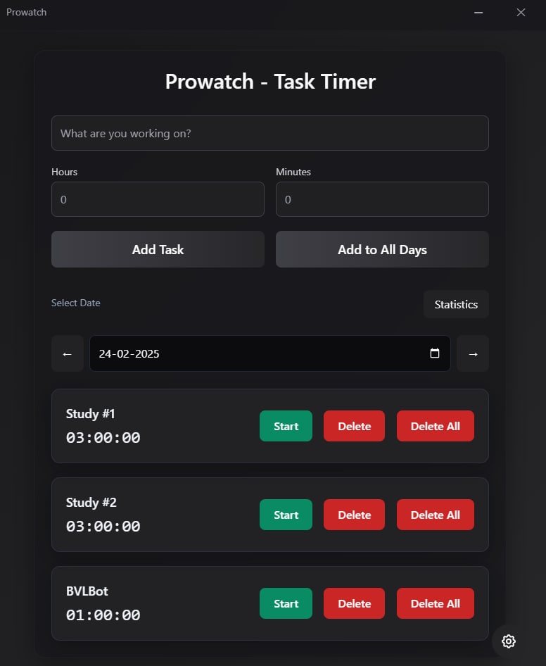 A modern task timer application with a sleek interface. Prowatch helps you manage and track your daily tasks with precision timing and detailed statistics.