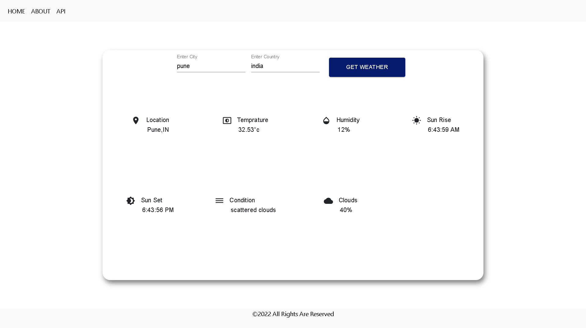 Weather App is a API based react web application . user can able to see weather of any city