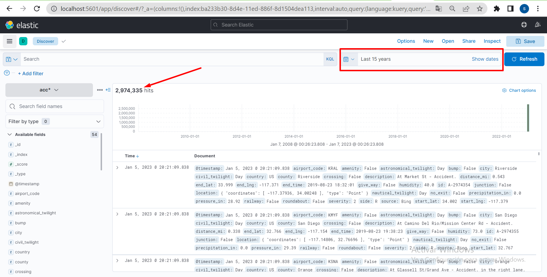 Para visualizar ElasticSearch puede usar kibana que está andando en docker, para acceder al mismo puede ir desde al navegador a http://localhost:5601/app/discover#, la primera vez tendrá que crear un index pattern, para ello solo presione el botón "create index" que se le muestra escriba "accident" en el label y presione aceptar (si le pide una referencia temporal seleccione @timestamp). Hecho esto reingrese a la url y podrá ver un listado de los accidentes de la DB (asegúrese que el rango temporal de la vista se encuentre en un tiempo razonable según el tiempo que pasó desde que cargo los datos, ya que por defecto solo muestra los accidentes cargados en los últimos 15 minutos).