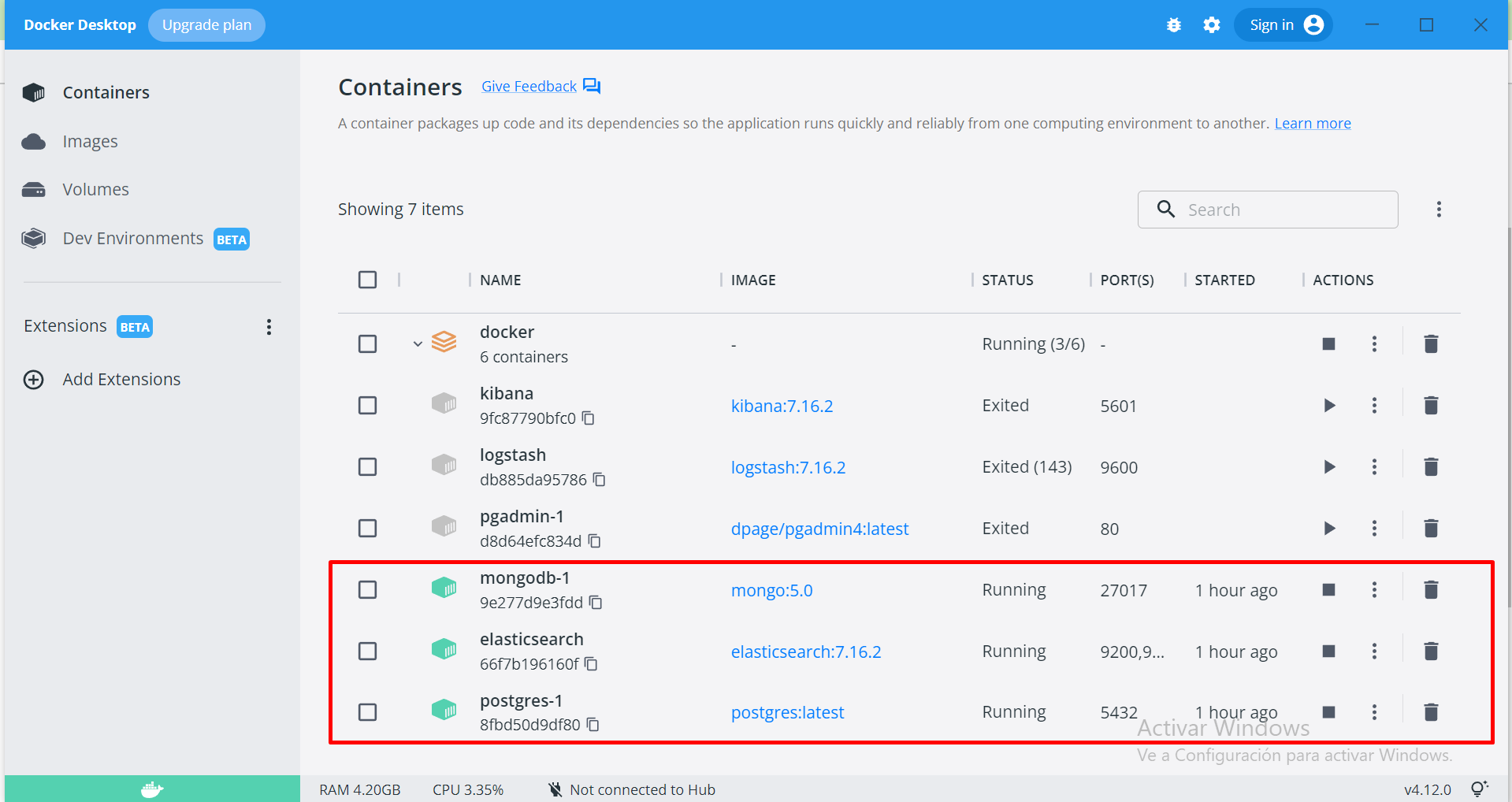 - Ahora toca ESPERAR a que los datos se carguen en los contenedores, esto varía según las especificaciones del equipo pero en general es un proceso bastante tardío, tenga en cuenta que tenemos 3 bases de datos que están cargando datos al mismo tiempo, PostgreSQL y MongoDB habran iniciado su carga de datos de forma automática cuando los finalizo el paso 2, ElasticSearch por otro lado recién habra iniciado su carga cuando ejecuto el contenedor logstash en el paso 4. Es probable que las 2 primeras termine la carga de datos en alrededor de 30-40 minutos, ElasticSearch por otro lado destaca en lo lento que es para insertar nuevos archivos, por lo que en un caso malo podría llegar a tardar hasta 1:30hs en finalizar la carga. Personalmente recomendamos ejecutar hasta el paso 4 e irse a hacer otra cosa durante alrededor de 1:00-1:30 horas.