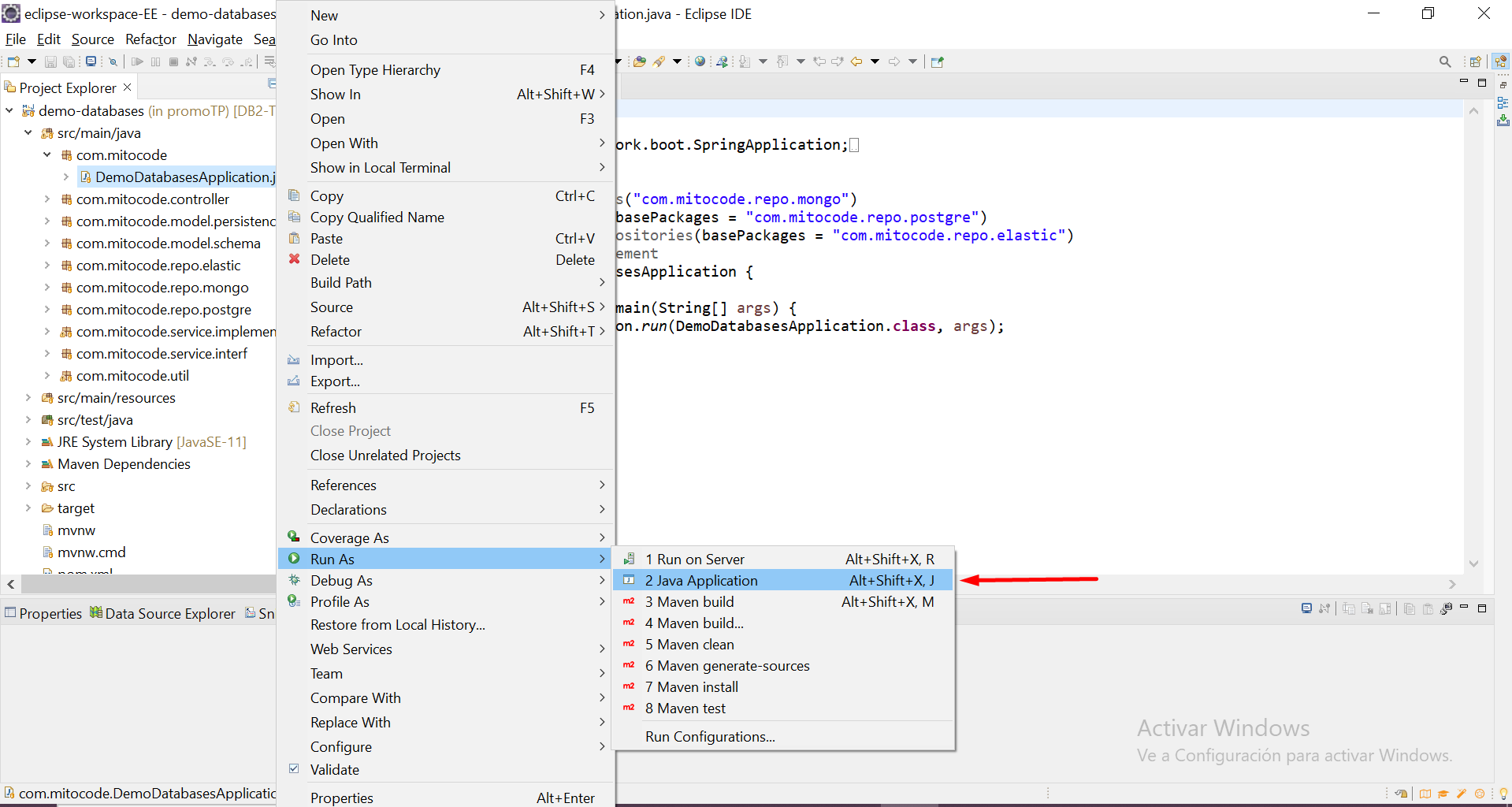 Realizados todos los pasos anteriores, para ejecutar el software basta con ir al Eclipse, ir a la carpeta correspondiente al proyecto, desde ahí avanzar a la carpeta "/src/main/java", seleccionar el paquete "com.mitocode", hacer click derecho en el archivo "DemoDataBaseAplication.java" y clickear la opción "Run As > Java Aplication".