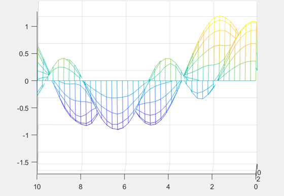 Example: Solving the wave equation using the command [x4a, t4a, U4a] = wave1d( 1, [0, pi], 10, [0, 10], 42, @u4a_init, @du4a_init, @u4a_bndry ) and displaying the solution using mesh( t4a, x4a, U4a )