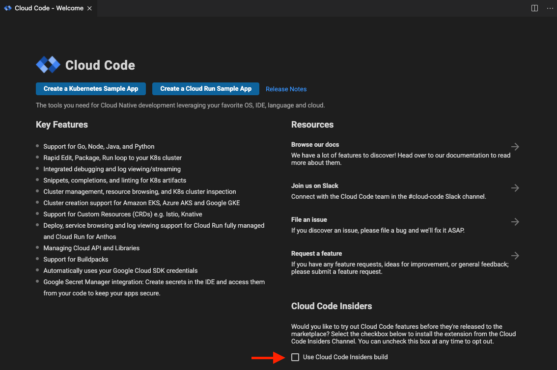 - Pre-release Channel: You can now use insider builds for trying out upcoming features and give us feedback before they are publicly released. You can go to cloud code settings “Cloud Code: Update Channel” and select an insider build that you want to try out. This will help us to make sure your development tools aren’t affected by the release of Cloud Code Plugin.