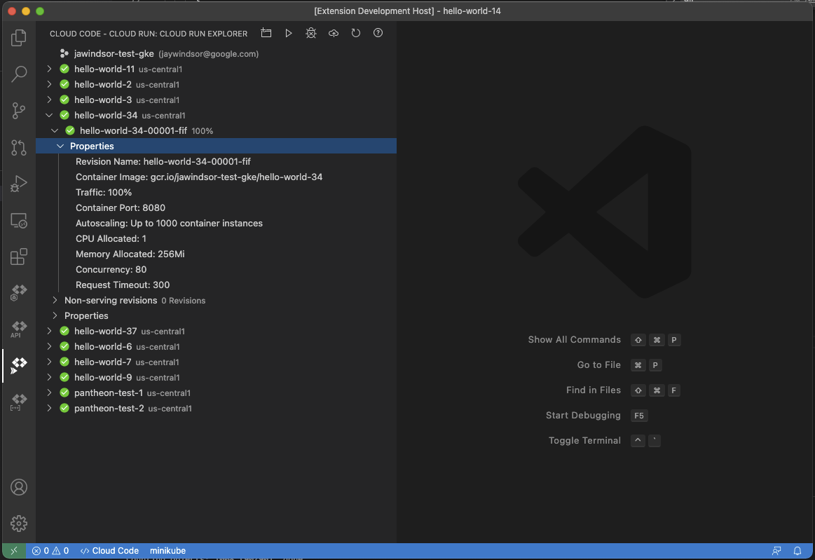- Browse your Cloud Run services directly from the IDE using the Cloud Run explorer. Easily see details of deployed services as well as revisions and status.