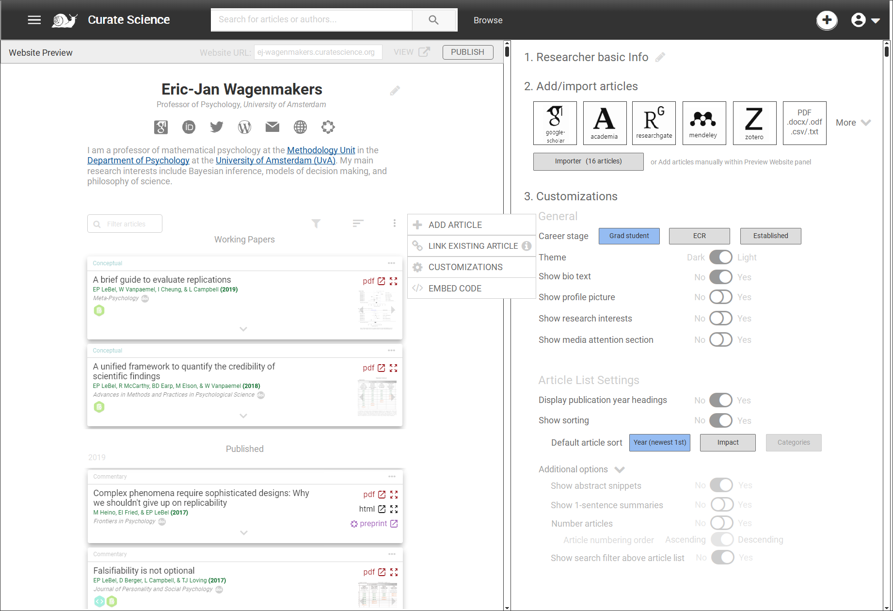NOTE: Main distinction between a Curate Science website and an author page, is that a website does NOT have a Curate Science navbar/etc. (ej-wagenmakers.curatescience.org rather than curatescience.org/author/eric-jan-wagenmakers), (hence is more professional), and is also more personalizable: e.g., it can use different layouts based on templates (e.g., Academic Hugo), one can add a profile picture, research interests, etc.