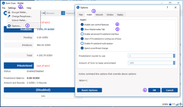Go to “Setting” -> “Options” -> “Wallet” -> In “Expert” section switch on “Enable coin control features” and “Show Masternodes Tab” -> Hit “OK”: