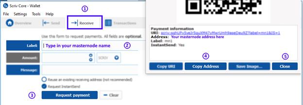 Go to “Receive” tab -> Enter any masternode name in “Label” field -> Press “Request payment” button.