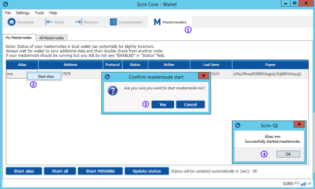Right-click it and press “Start alias” -> Confirm by clicking “Yes” -> If everything is setted up fine, you will have “Successfully started masternode” message -> Hit “OK”.