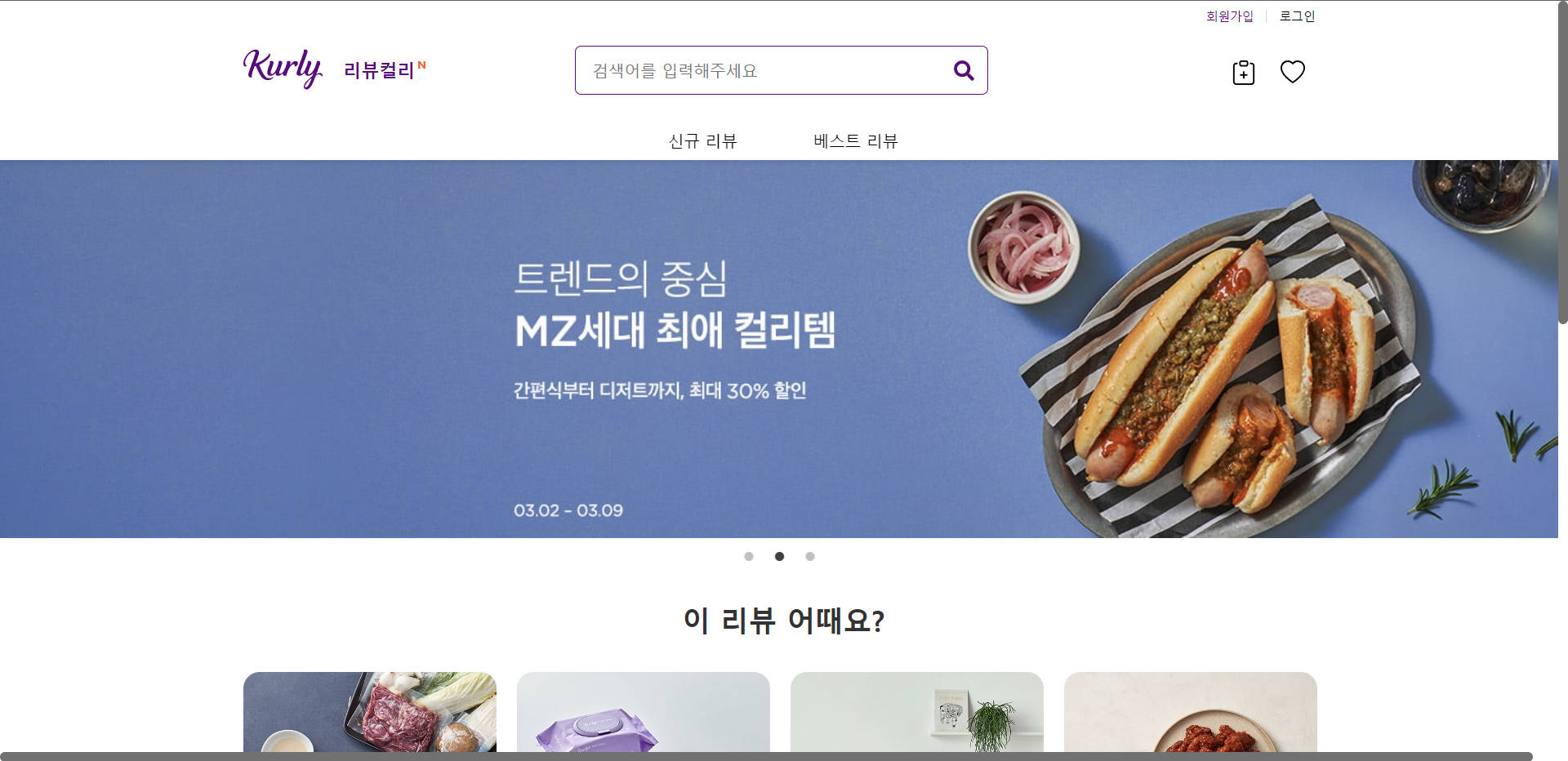 home 화면에서 리뷰컬리에 등록된 리뷰들을 랜덤으로 보여지게 합니다. 슬라이드 형식으로 자연스럽게 출력됩니다. 헤더에는 검색 버튼, 리뷰등록, 신규리뷰탭, 베스트리뷰탭이 존재하여 사이트를 탐색할 수 있습니다. 홈 화면 및 신규리뷰 베스트리뷰 상세페이지는 로그인 없이 누구나 탐색이 가능합니다.