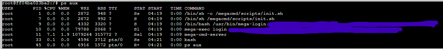 ps aux shows init twice after initial boot, as well as passwords passed via the script when running