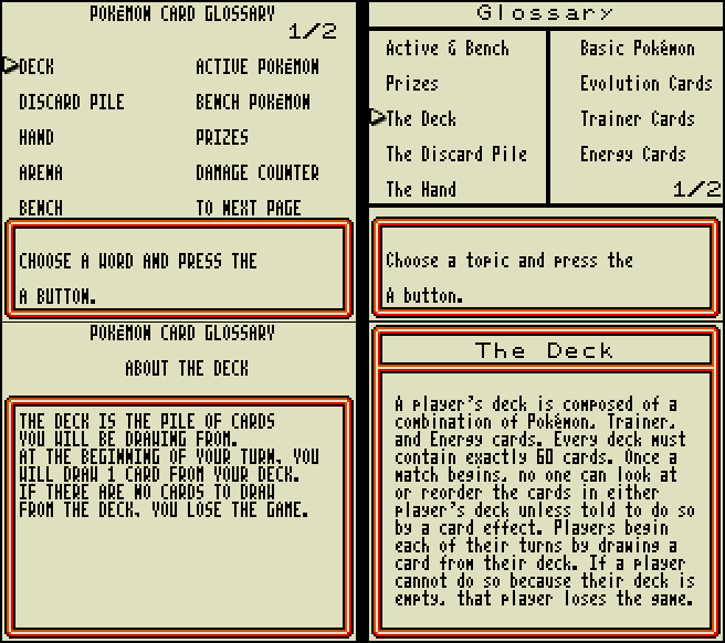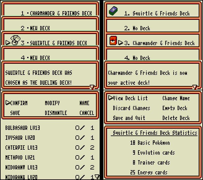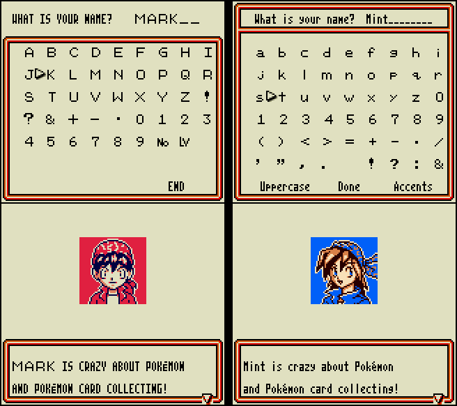 This is a modified disassembly of Pokémon Trading Card Game for the Game Boy Color. It was originally designed to be used as a base for future romhacks, but it can also be used as an improvement hack for people looking to replay the original game. A lot of the changes deal with more efficient code and better function comments and are therefore not likely to be noticed by prospective players, but there are plenty of other differences that are much easier to see. All displayed text is now mixed case instead of uppercase only, and the in-game keyboard was significantly expanded to offer more variety when naming both the protagonist and custom decks. Players can choose to play as either Mark or Mint, like in the sequel. The tutorial at the start of the game is now optional. Various text throughout the game was edited to better fit the 2-line display in the textboxes, and some of the menu screens were redesigned; the glossary in particular is almost entirely different from its original incarnation. It's also worth noting that numerous glitches present in the base game were fixed. For a full overview of the changes that were made to the original game, see CHANGELOG.md. However, seeing as a picture is worth a thousand words, here are a few side by side comparisons between the original game and poketcg_v2.
