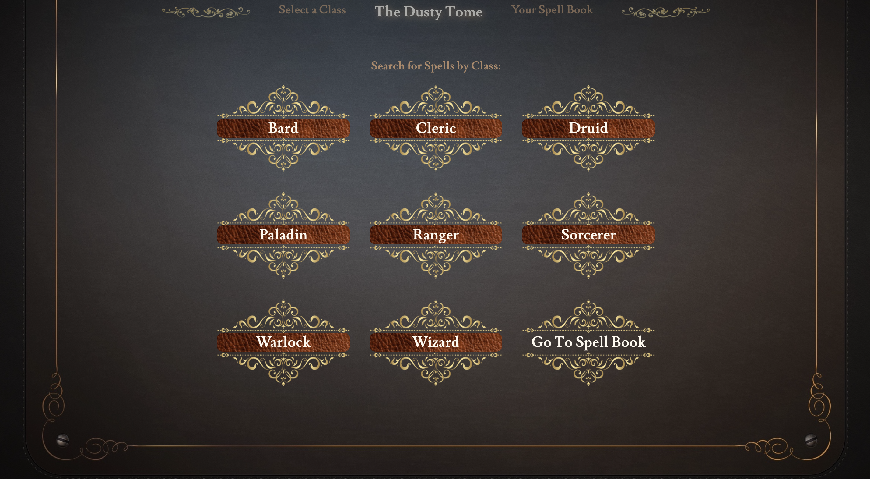 The Dusty Tome is a customizable spell search and spell book creator for Dungeons and Dragons 5th Edition. Search for spells available to the Bard, Cleric, Druid, Paladin, Ranger, Sorcerer, Warlock, or Wizard classes. View each spell's details and add them to your own personal Spell Book. All spell scrolls added to your spell book can then be viewed in your own dusty leather-bound tome for easy lookup in game!