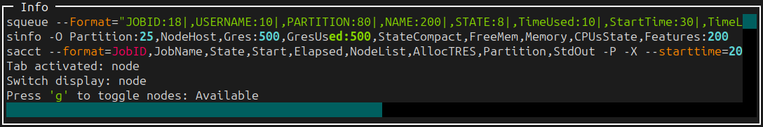 sinfofor information of nodes, GPUs, etc.squeuefor current jobs in the queuesacctfor history jobs