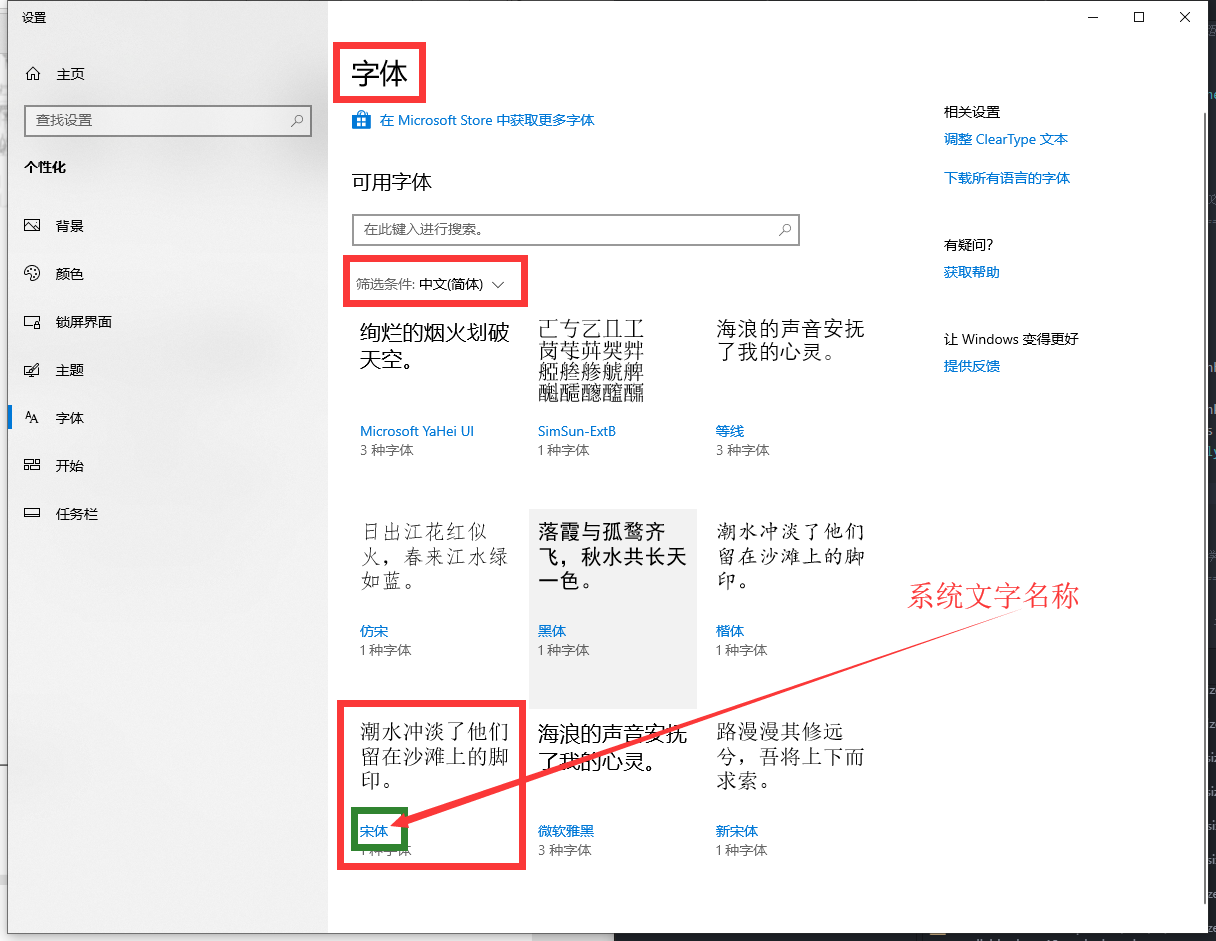 上图中所用的 宋体黑体楷体等字体名称,通过查找window系统安装字体名称,来更换需要的字体,或者仿照格式自定义自己的字体格式。在系统中搜索字体并打开: