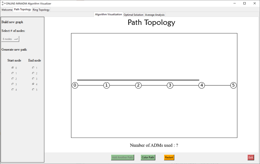 Another functionality is that you can compare some network over the optimal solution and see where the online algorithm MINADM colors the paths differently. Also, you can see the number of ADMs used using the optimal solution and the solution of the algorithm.