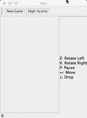 Yatc is an attempt at a tetris code written in JAVA. It uses JAVA's built-in high-score system, which creates a file called "scores.dat" in the current working directory. The controls are: