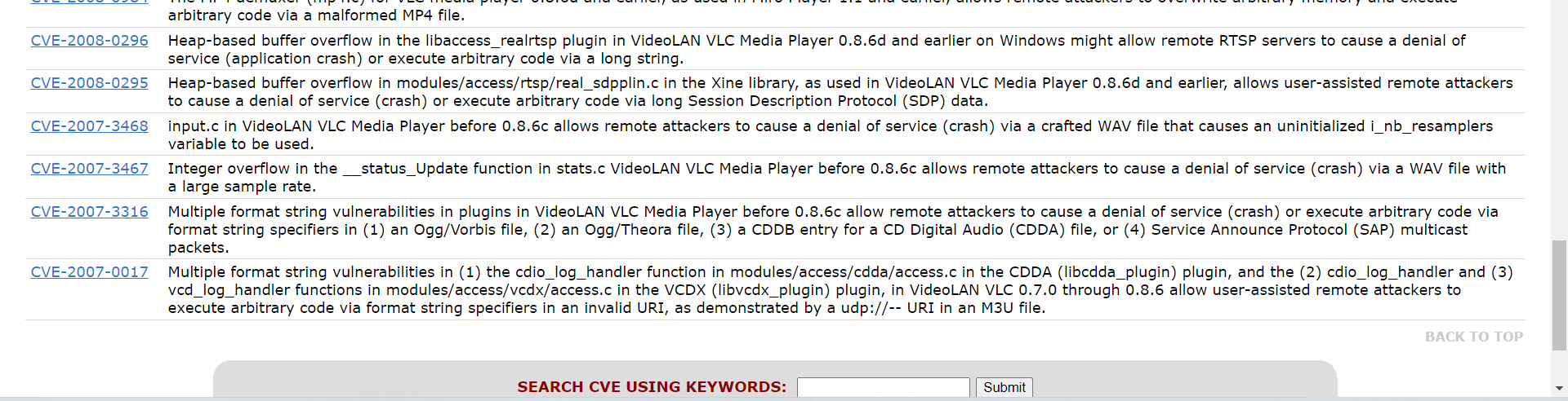What is the very first CVE found in the VLC media player?