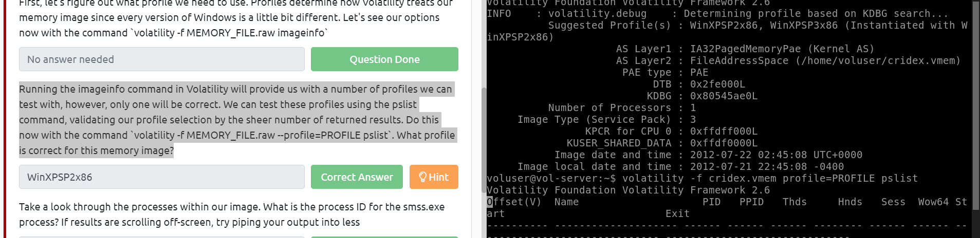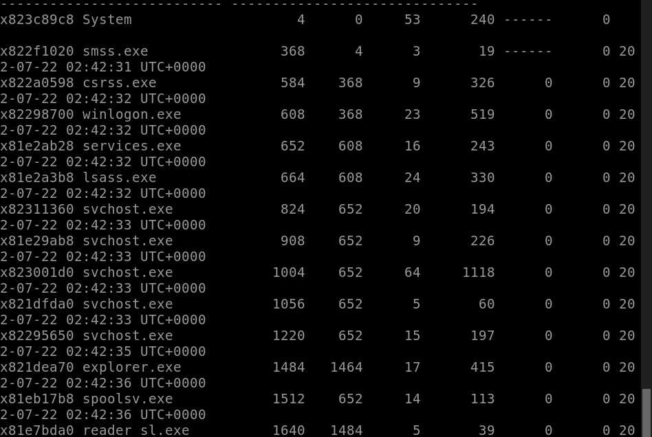 Take a look through the processes within our image. What is the process ID for the smss.exe process? If results are scrolling off-screen, try piping your output into less