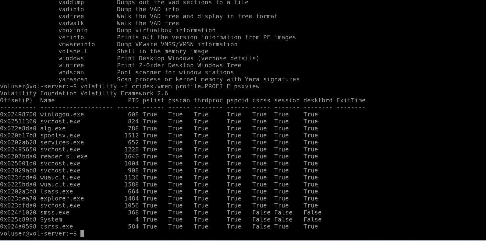 It's fairly common for malware to attempt to hide itself and the process associated with it. That being said, we can view intentionally hidden processes via the command psxview. What process has only one 'False' listed?