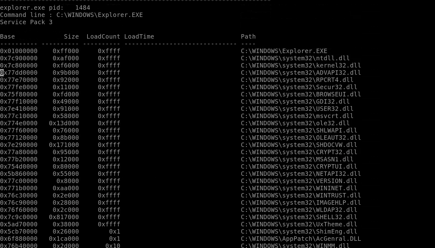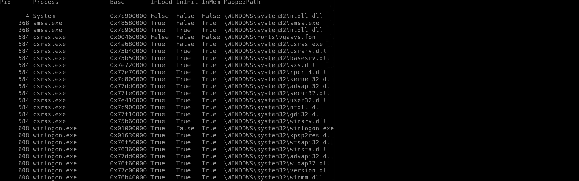 In addition to viewing hidden processes via psxview, we can also check this with a greater focus via the command 'ldrmodules'. Three columns will appear here in the middle, InLoad, InInit, InMem. If any of these are false, that module has likely been injected which is a really bad thing. On a normal system the grep statement above should return no output. Which process has all three columns listed as 'False' (other than System)?