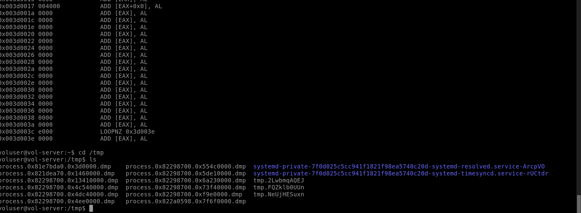 malfind. Using the full commandvolatility -f MEMORY_FILE.raw --profile=PROFILE malfind -D <Destination Directory>we can not only find this code, but also dump it to our specified directory. Let's do this now! We'll use this dump later for more analysis. How many files does this generate?