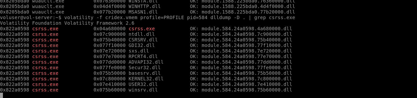 Now that we've seen all of the DLLs running in memory, let's go a step further and pull them out! Do this now with the command volatility -f MEMORY_FILE.raw --profile=PROFILE --pid=PID dlldump -D <Destination Directory>where the PID is the process ID of the infected process we identified earlier (questions five and six). How many DLLs does this end up pulling? quay lại ảnh của câu hỏi trước dễ thấy PID của csrss.exe là 584