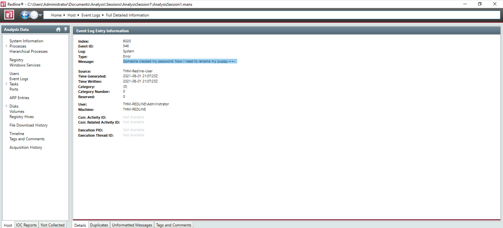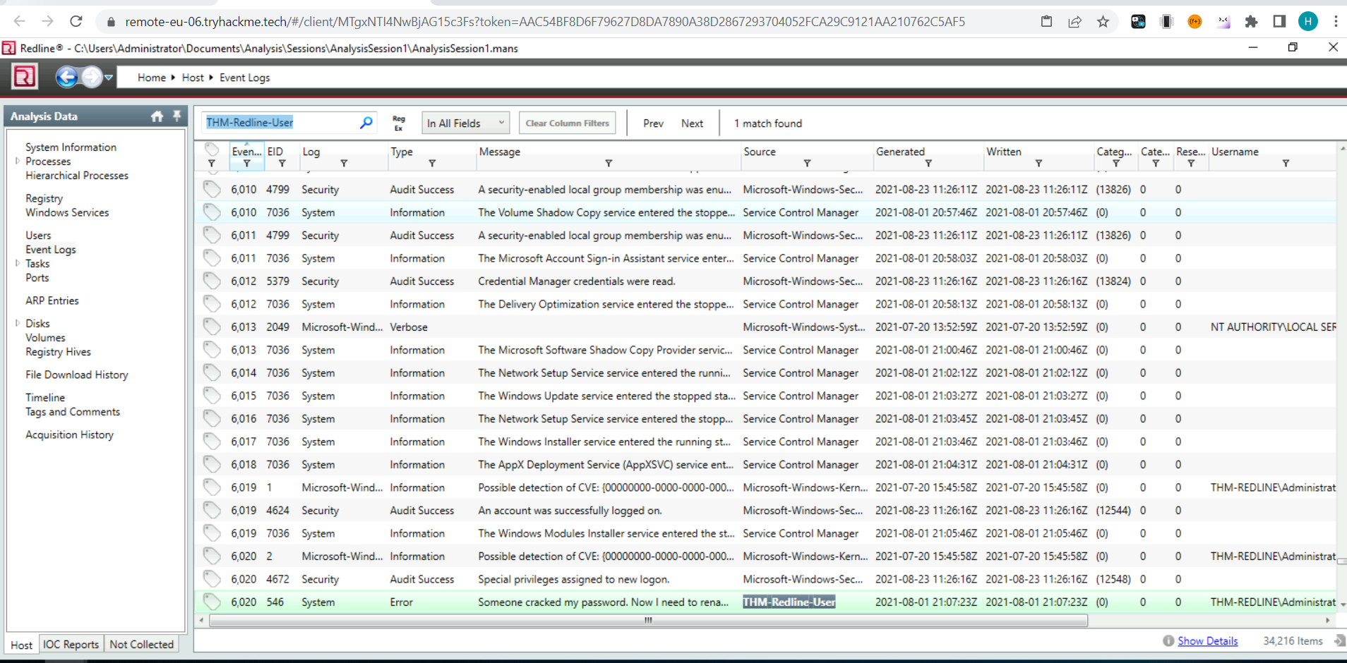 There is a new System Event ID created by an intruder with the source name "THM-Redline-User" and the Type "ERROR". Find the Event ID #.