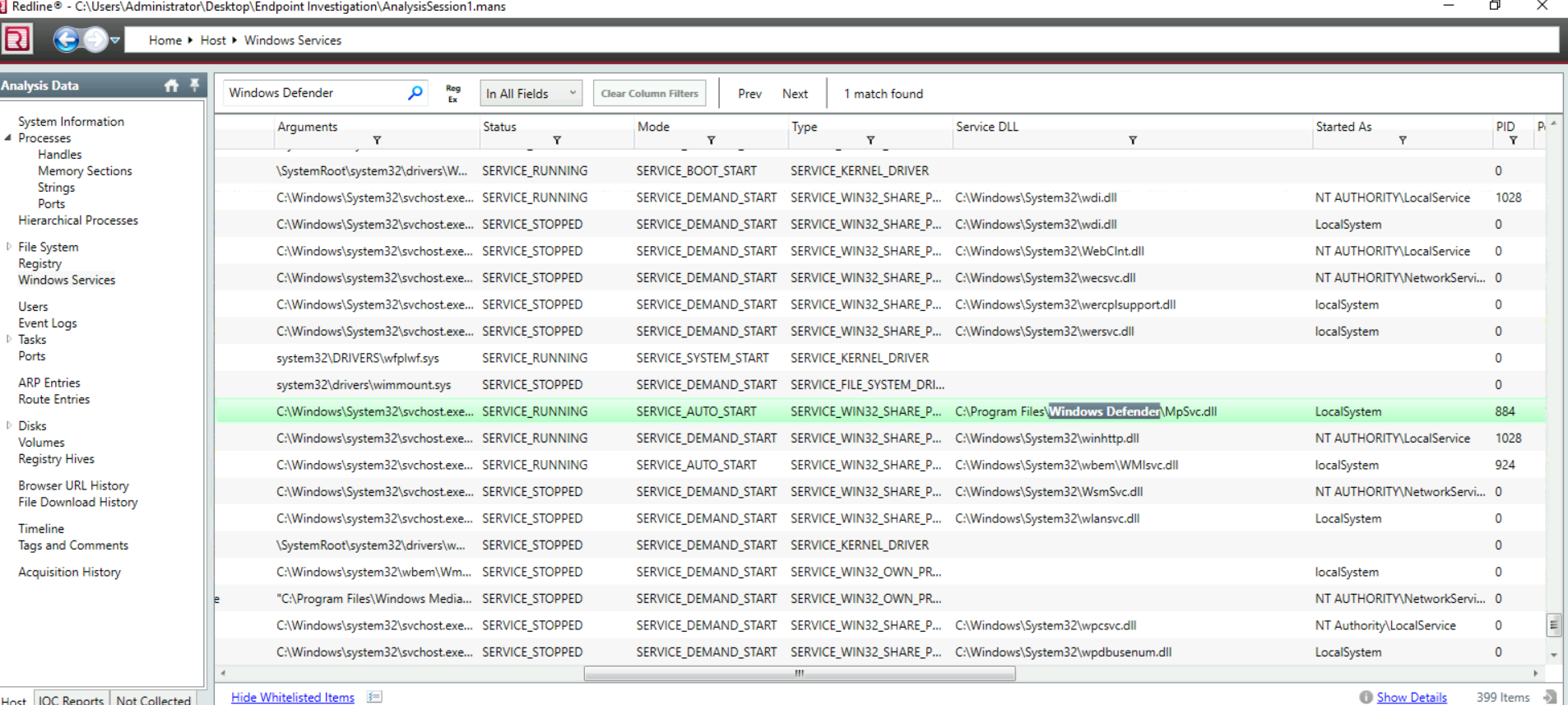 Find the Windows Defender service; what is the name of its service DLL?