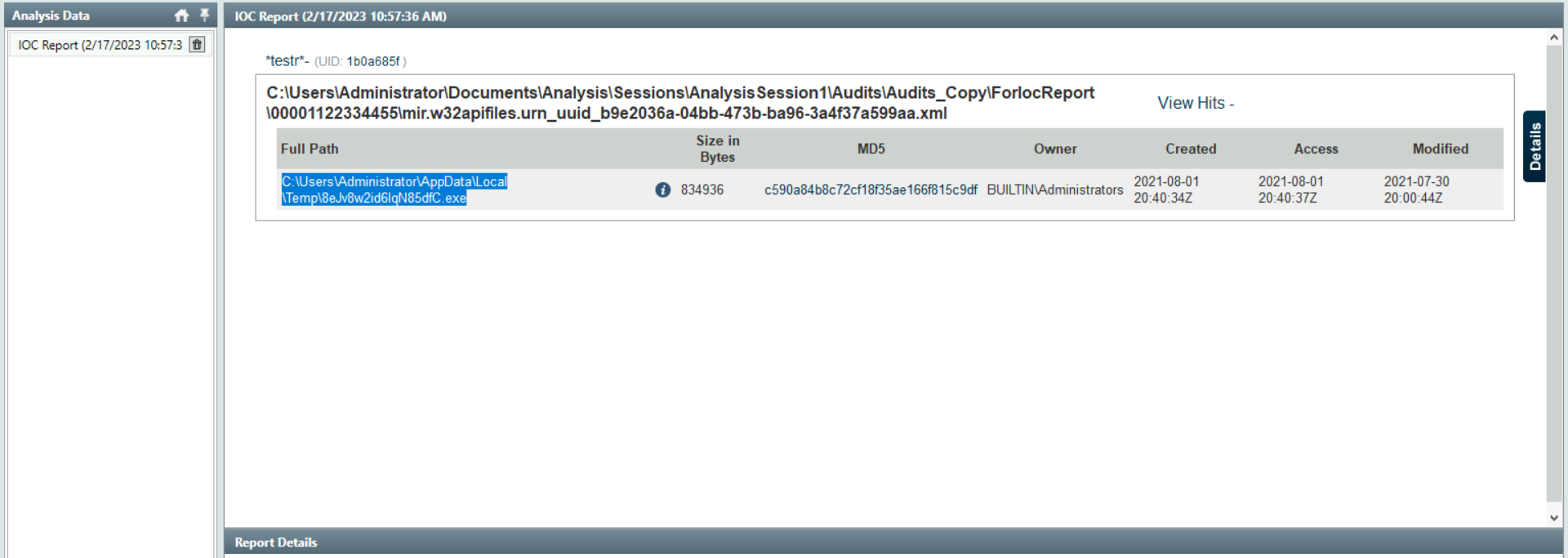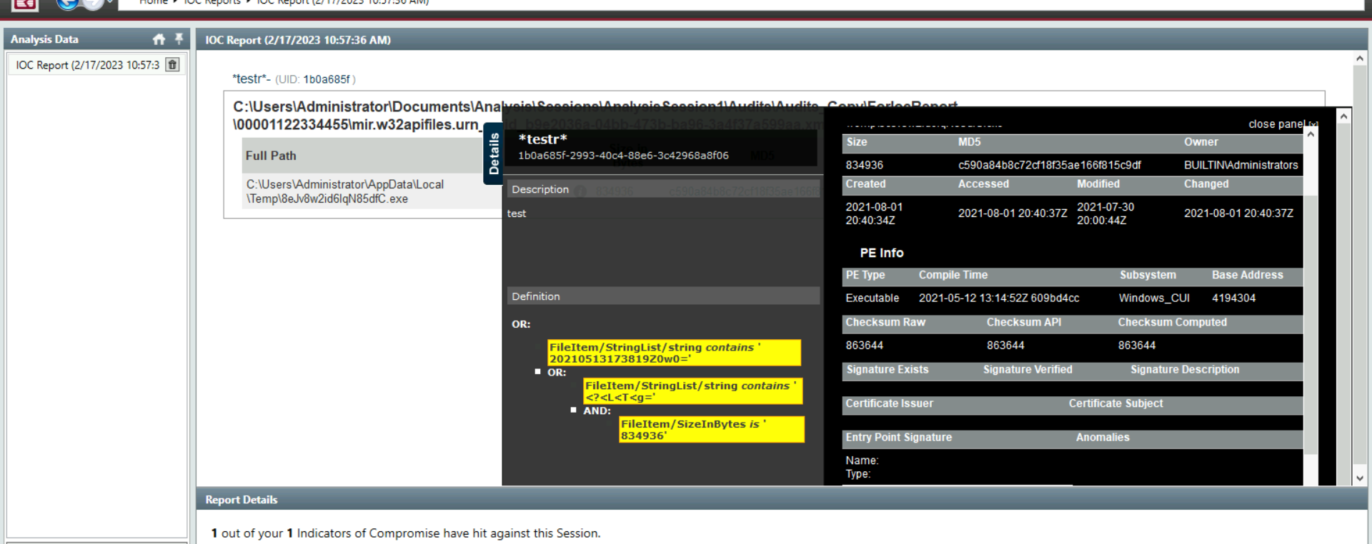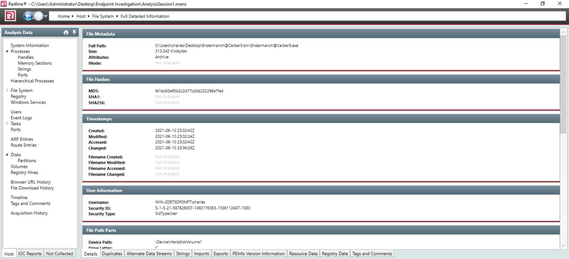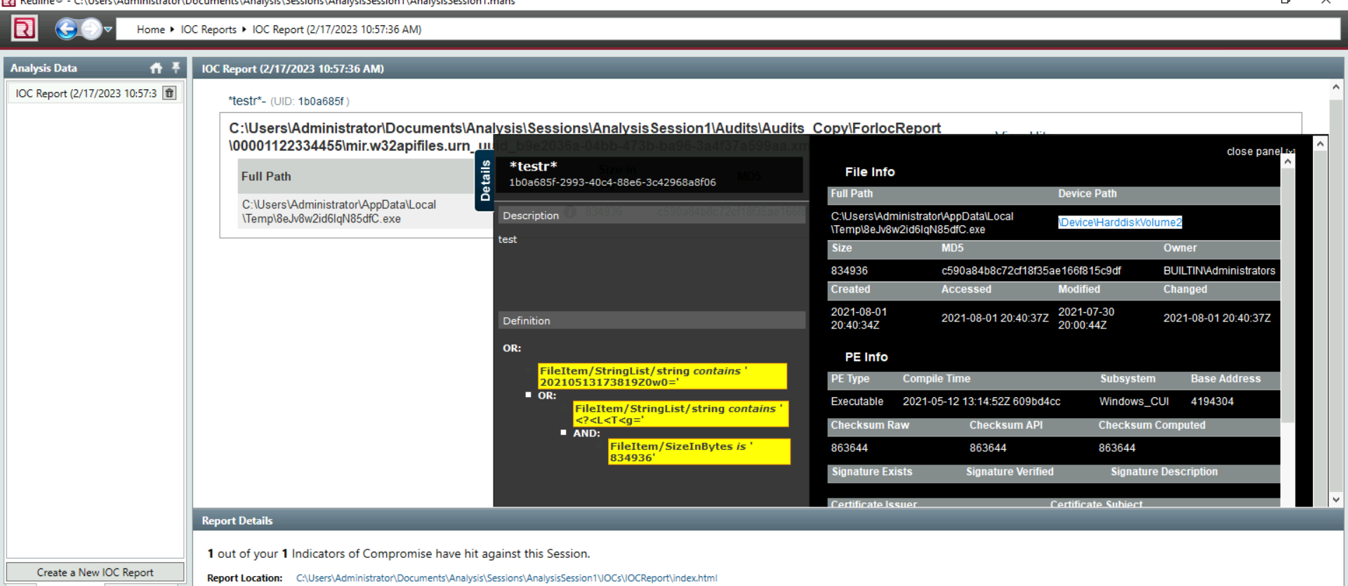 Provide the full path of where the .ioc file was placed after the Redline analysis, include the .ioc filename as well