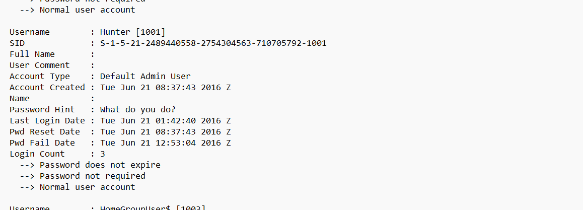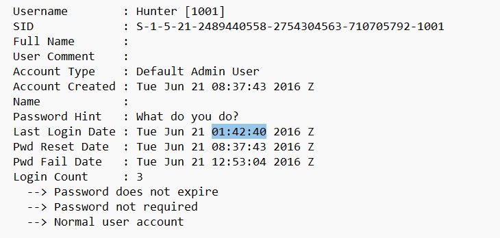 When was the last login time for the discovered account? Format: one-space between date and time