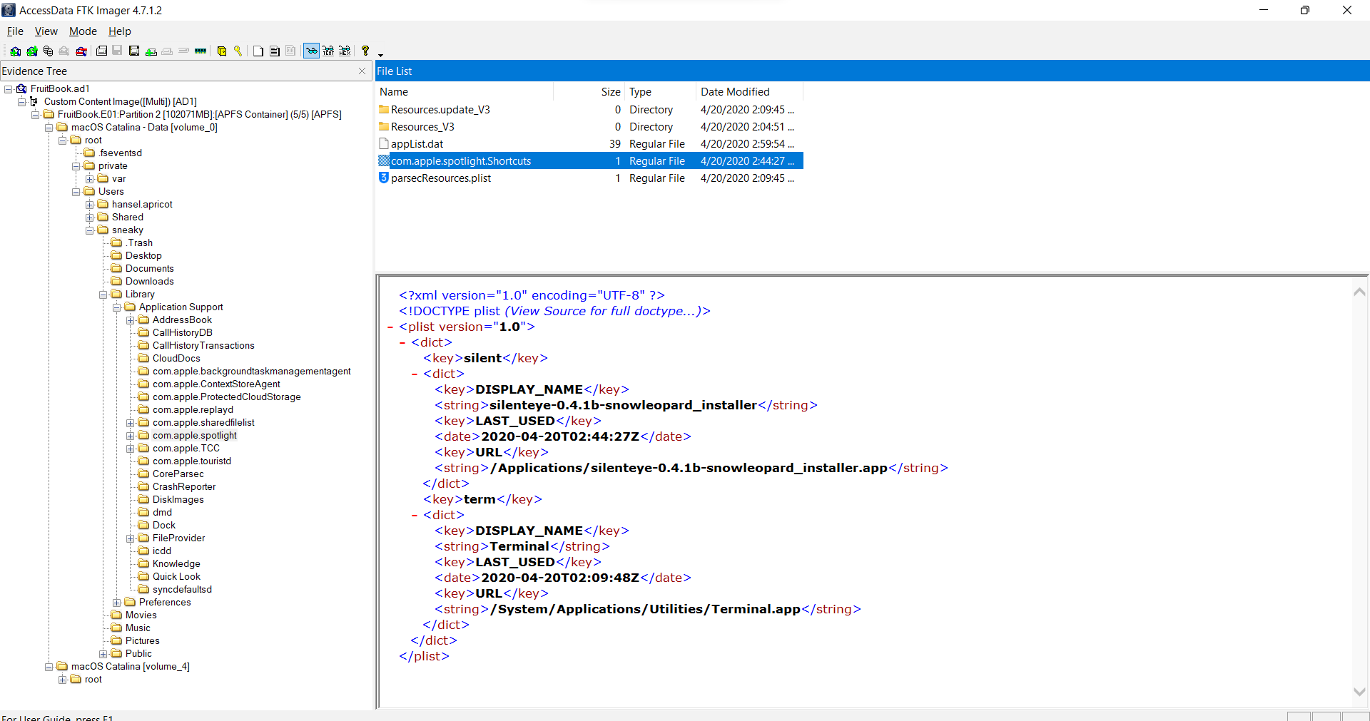 What was exactly typed in the Spotlight search bar on 4/20/2020 02:09:48