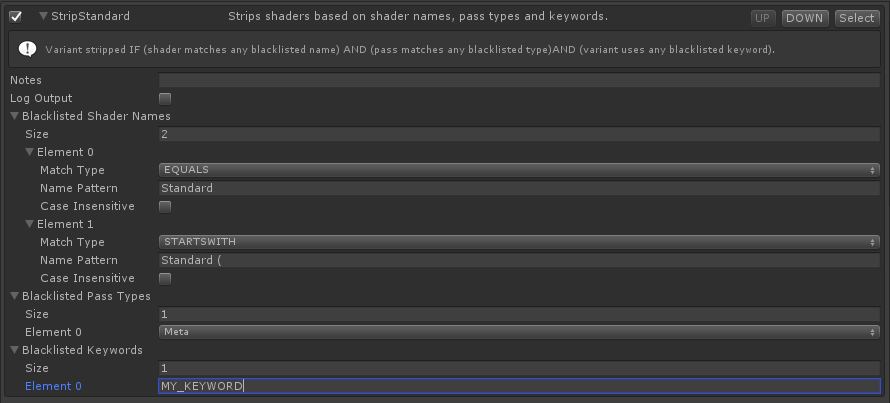 You can override MatchShader, MatchPass and/or MatchVariant to tie into the basic behaviour of ShaderStripper. Override _checkShader, _checkPass and _checkVariant to tell ShaderStripper which of these methods to call. The results of the methods are combined as ANDs, and called in the order Shader => Pass => Variant.