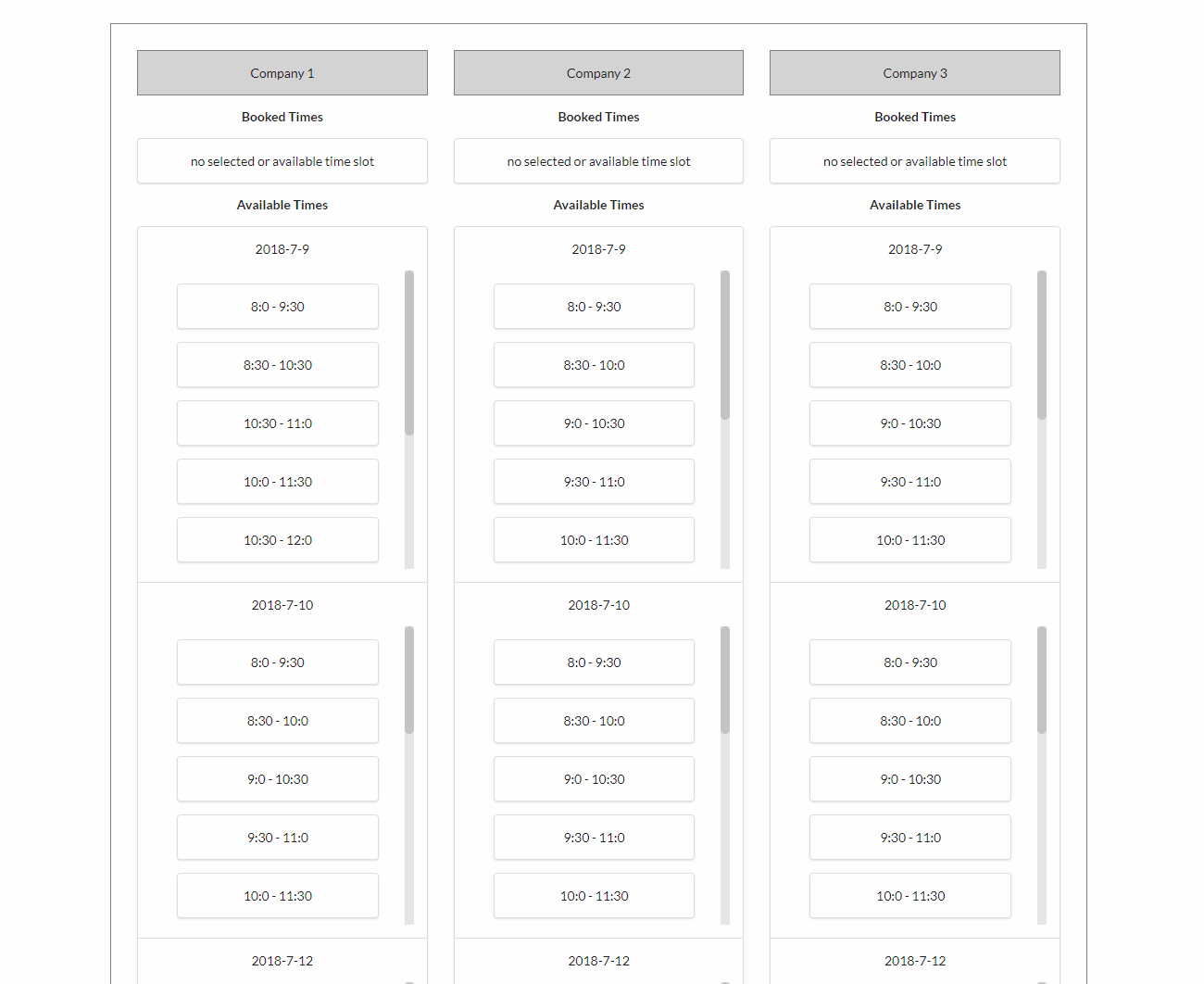 Allows users to choose a possible time slot for their company. Simple UI with added unit test for each component