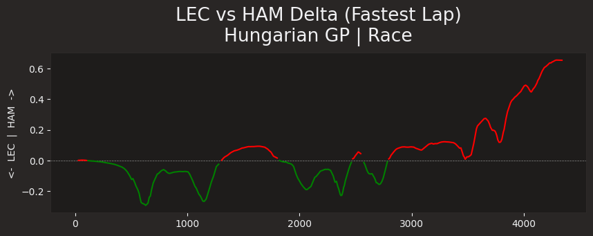 Plot the driver1 delta to driver2 over a single lap in the session.