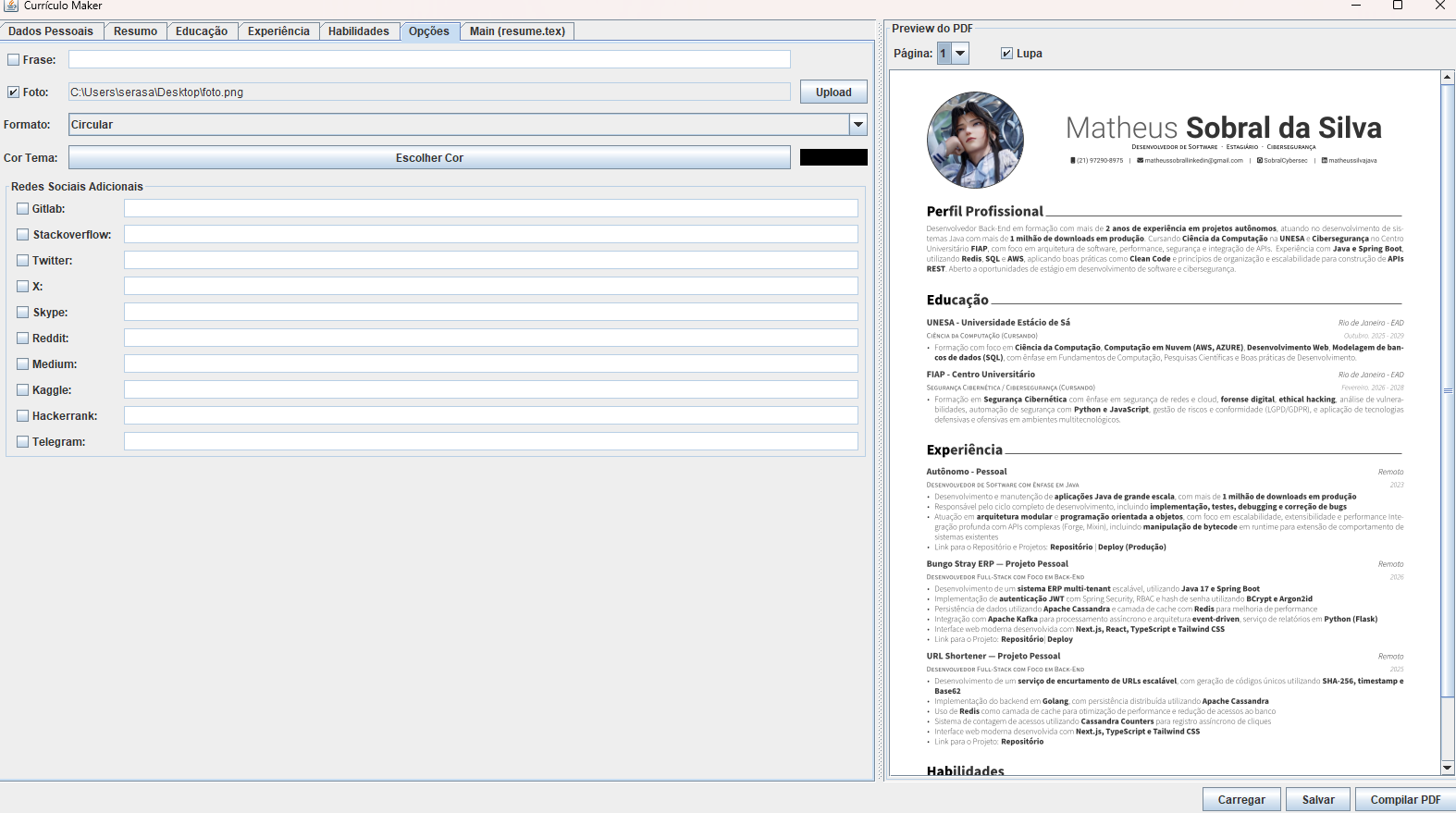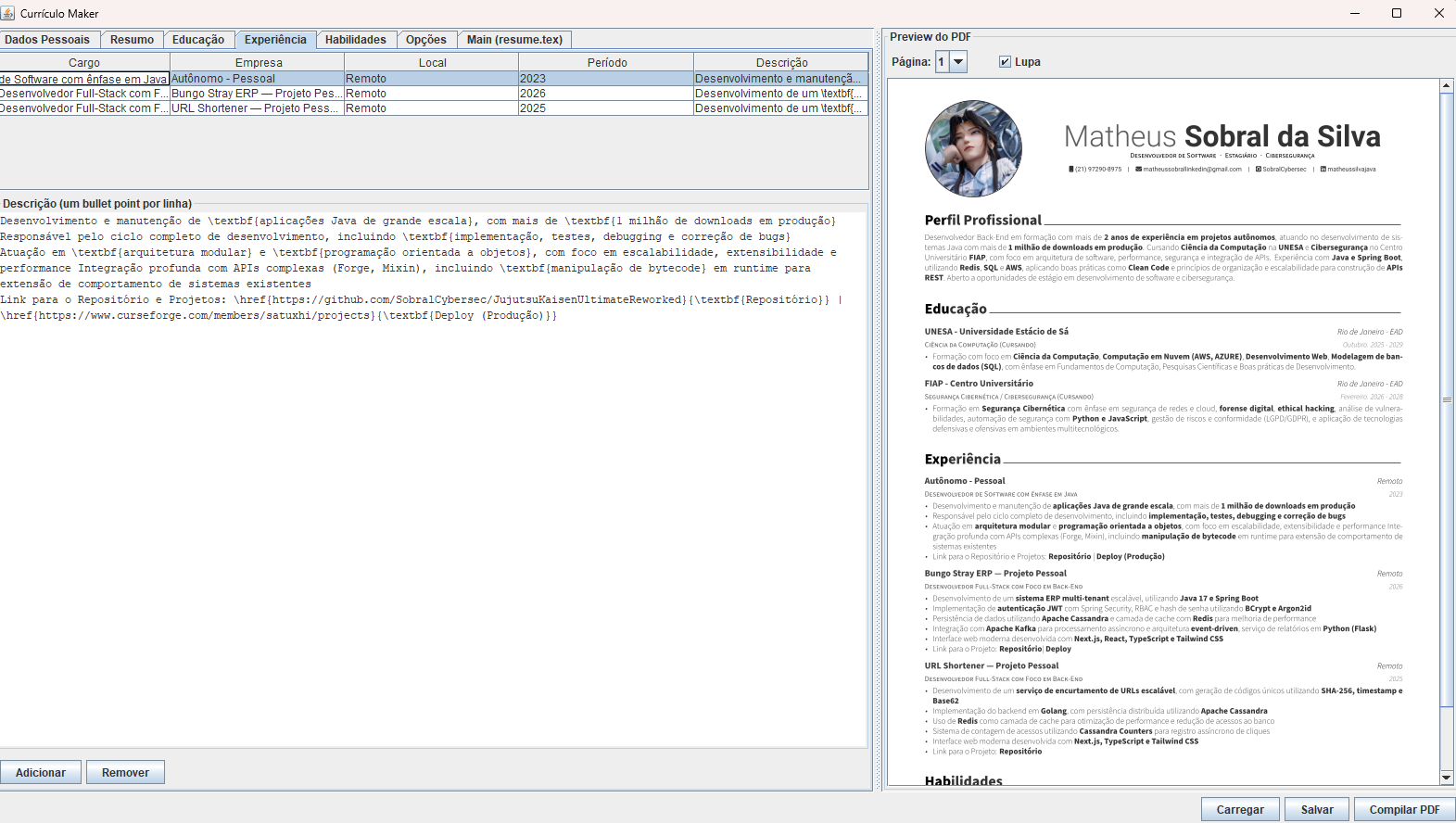- Adicionado editor visual de currículos LaTeX com interface Swing