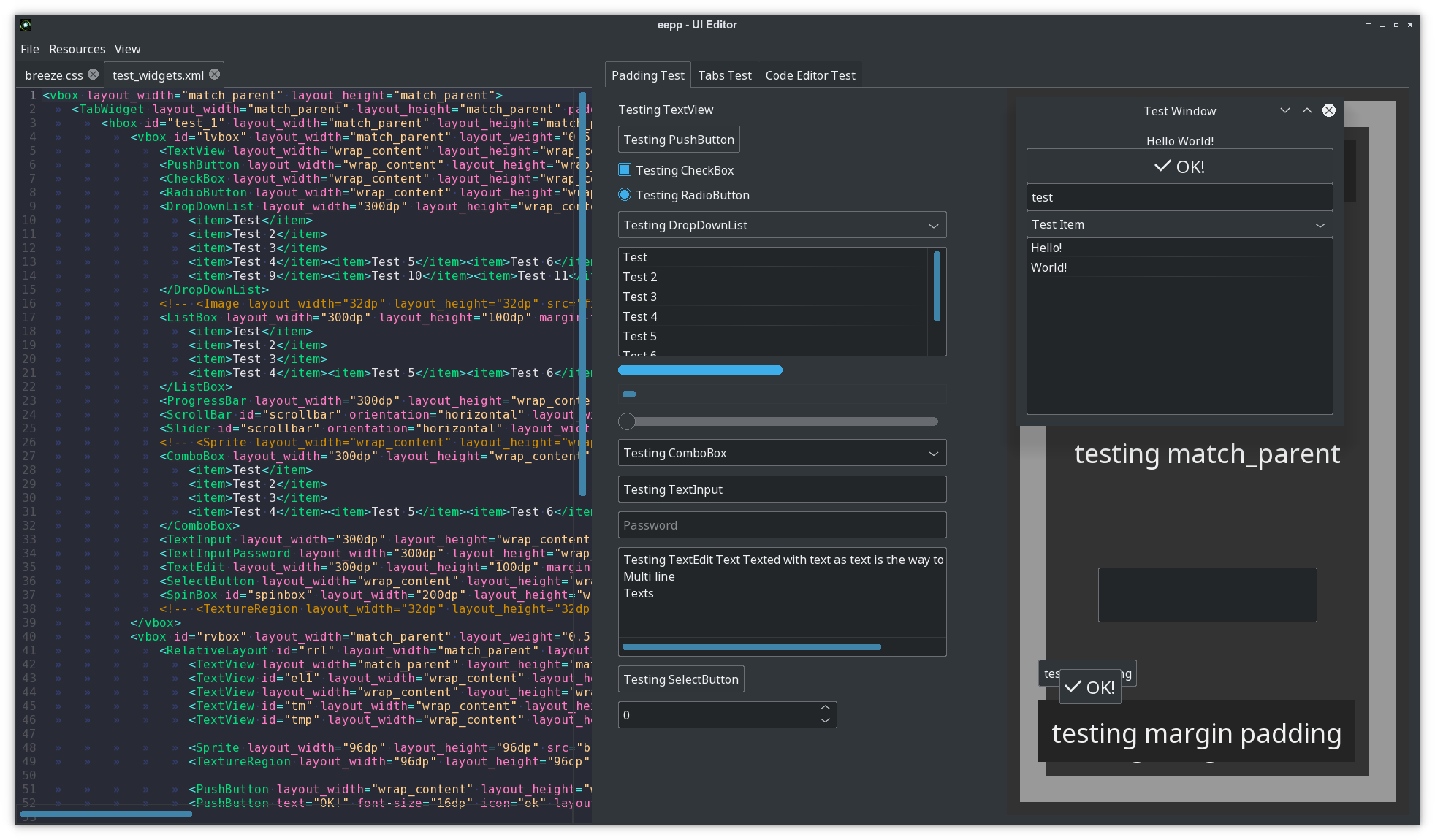 Editor that displays in real-time the changes on any layout and CSS to help speed up the development of user interfaces. In the screenshot is displaying some of the default widgets available in eepp.
