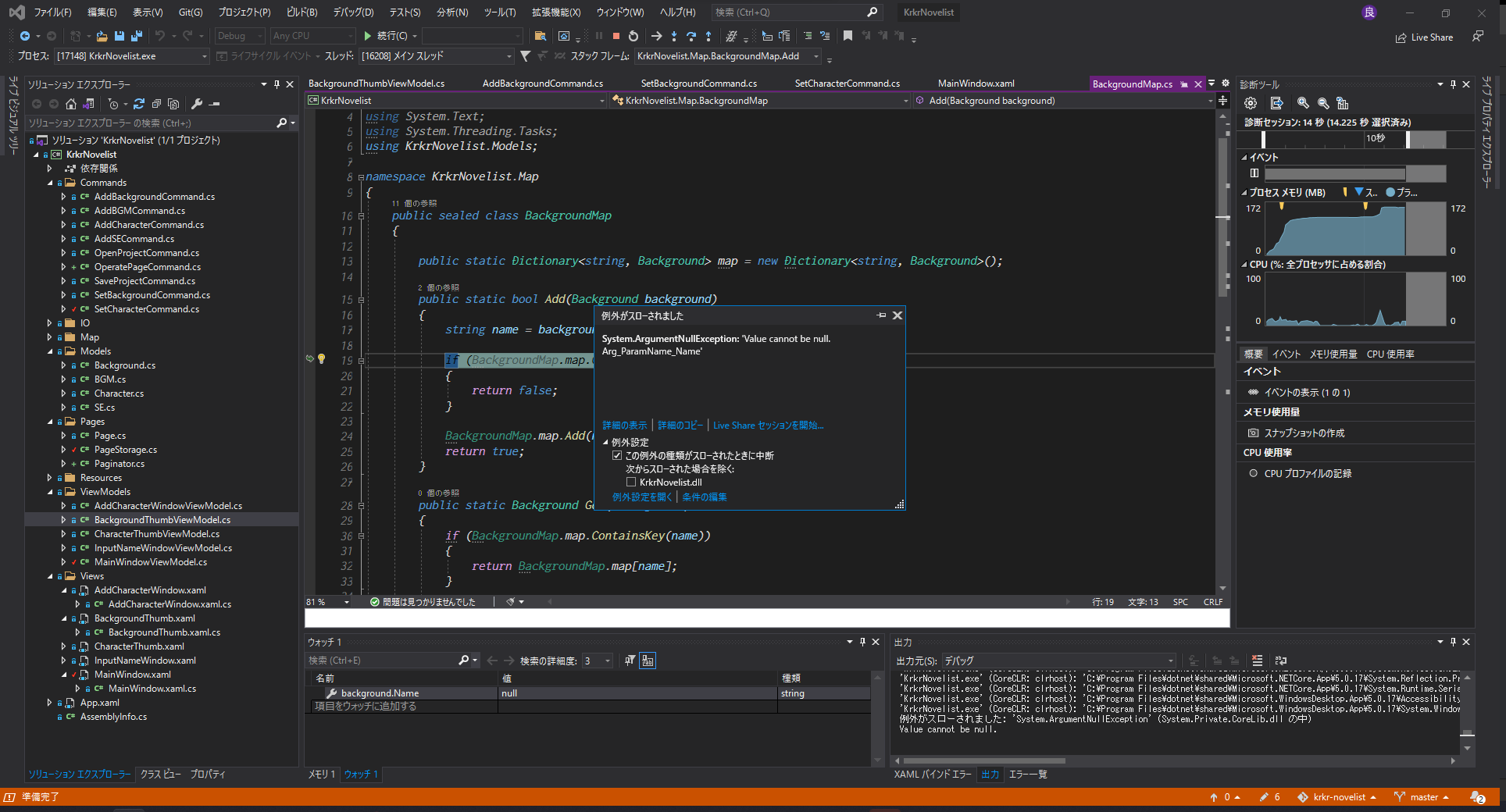 `ViewModels/BackgroundMap.cs` の19行目で、`name` が `null` になっているのに ```cs BackgroundMap.map.ContainsKey(name) ``` としているため `System.ArgumentNullException` が投げられてる なんで `name` が `null` になっているのか調べる必要がありそう