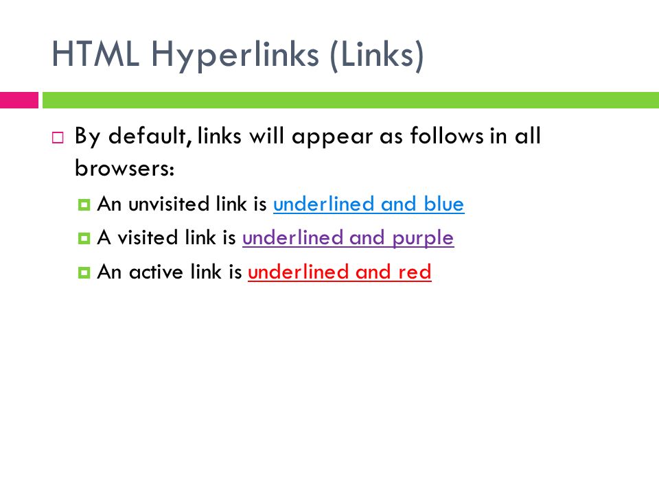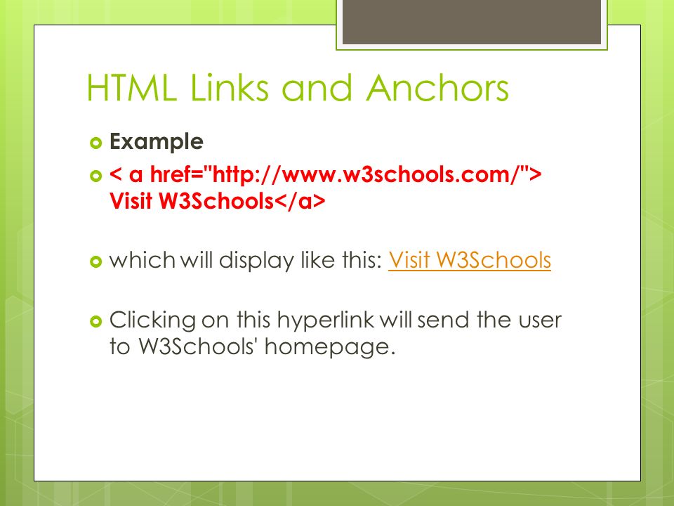 Links are created using the <a> element. Users can click on anything between the opening <a> tag and the closing </a> tag. You specify which page you want to link to using the href attribute