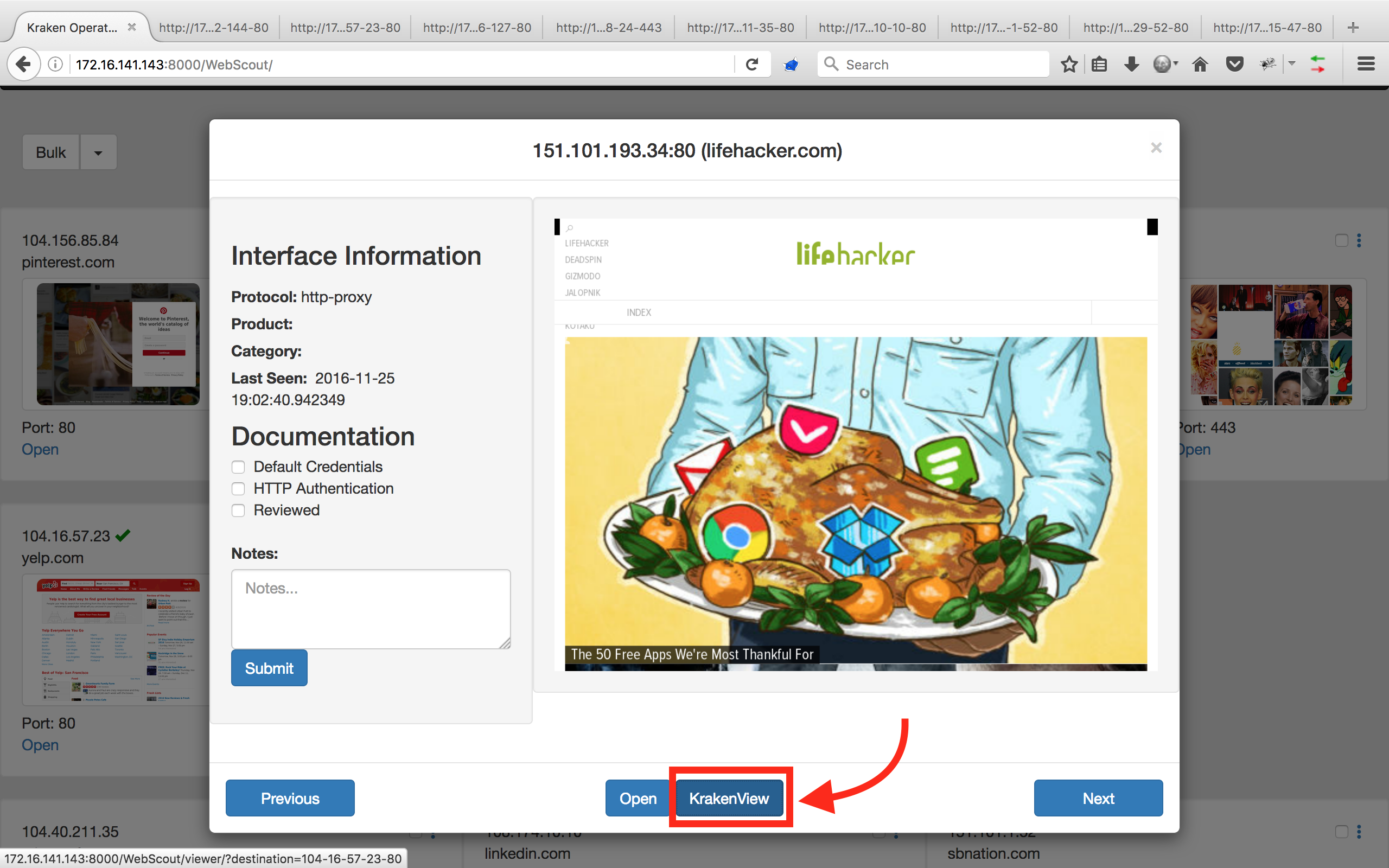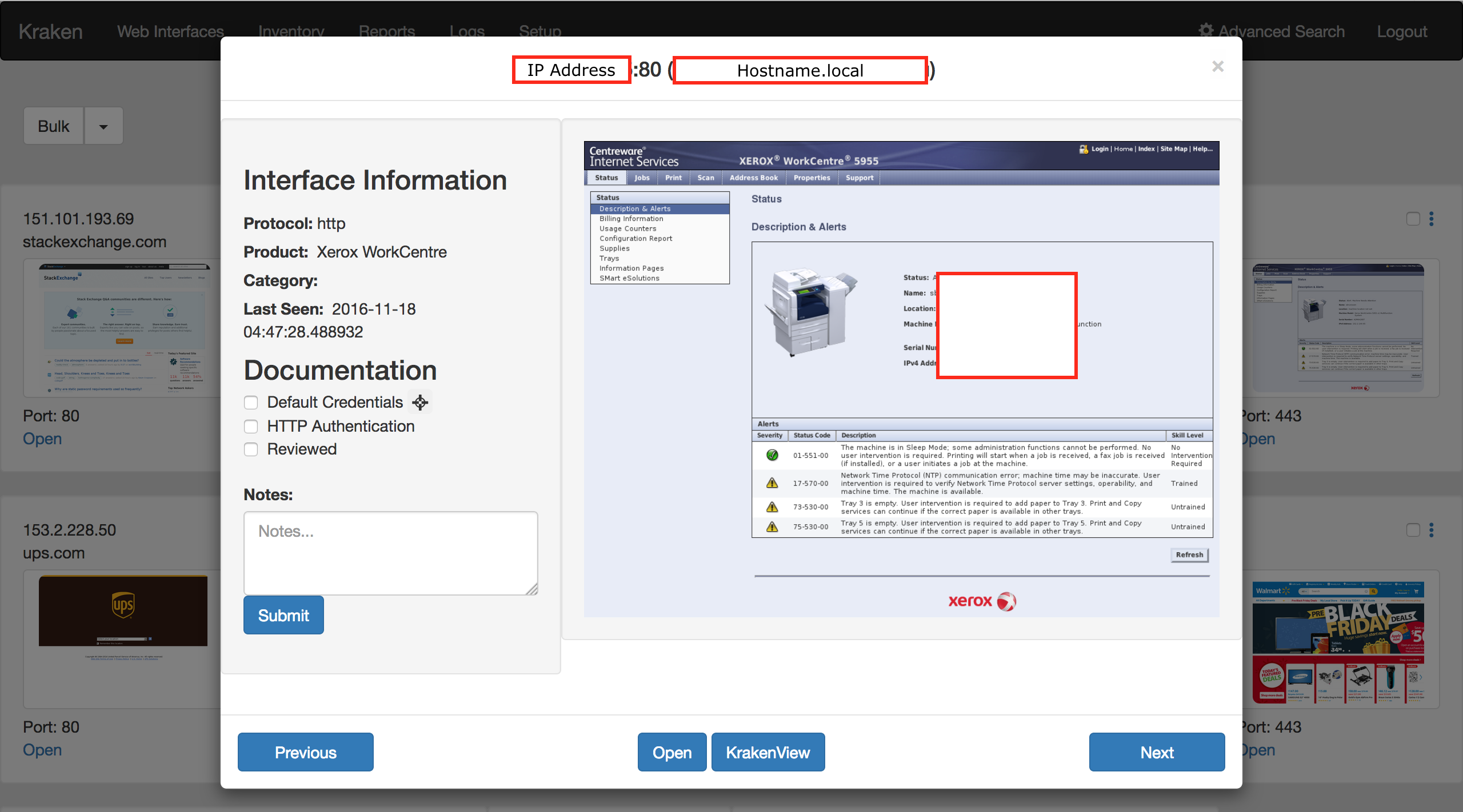 Click on a thumbnail will open the screenshot in a popup. The popup contains more information on the interfaces and provides the ability to take notes. Notes are stored in the database and can be viewed on the 'Reports' page. Clicking 'Open' or 'KrakenView' in the popup, or clicking the 'open' link on the host field, will open the interface in a new tab and mark the host as 'Reviewed'.