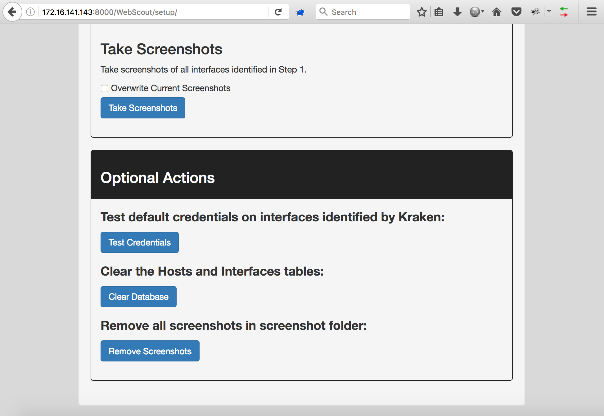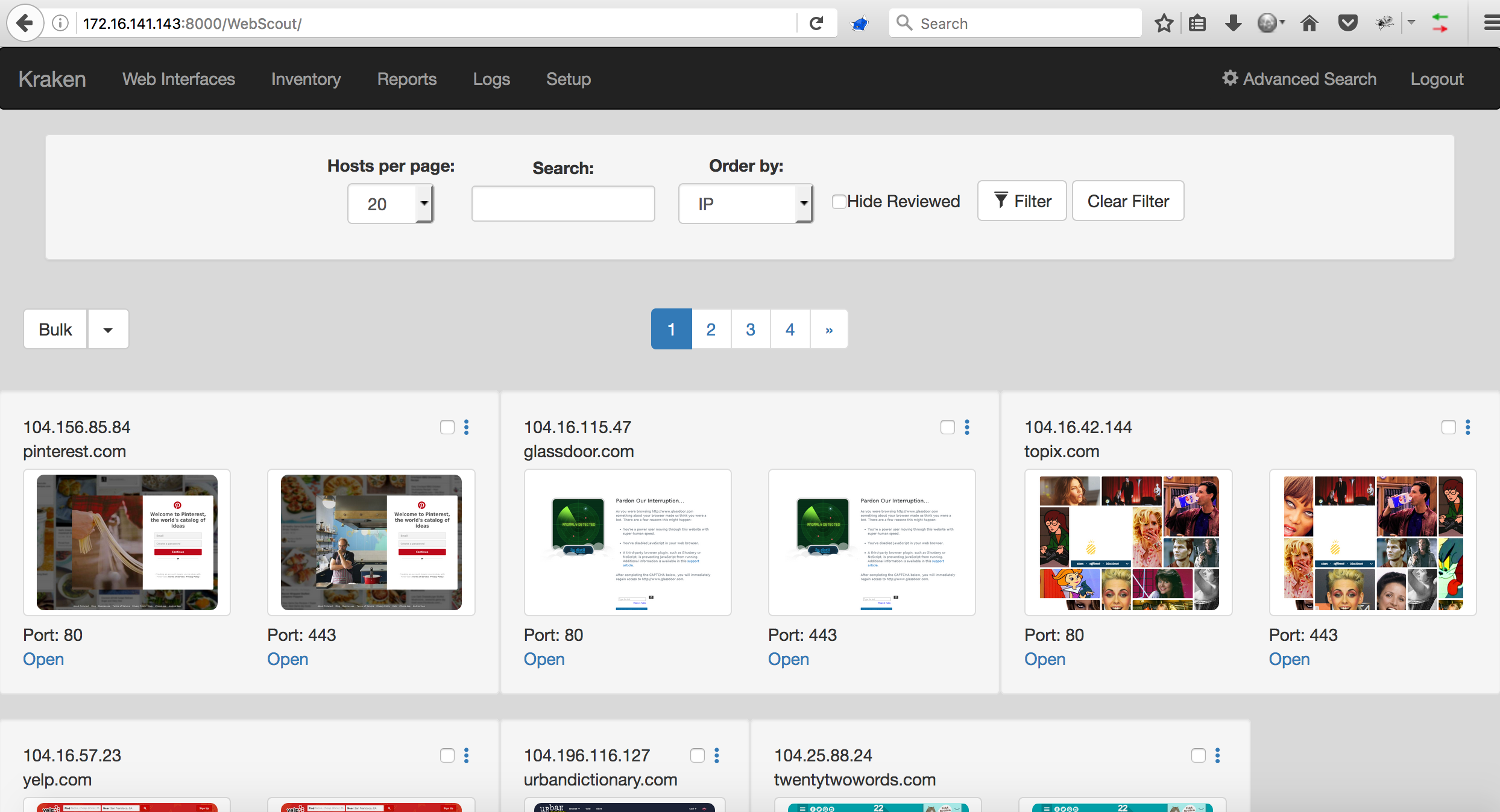 Assessing web interfaces with Kraken is a fairly intuitive process. The 'Web Interfaces' page is where the assessing will take place. Pages list 20 hosts by default. That number can be changed by clicking 'Advanced Search' on the right side of the navigation bar. Each host field contains a screenshot of all the web interfaces hosted on that host along with some metadata and a link to open the interface in a new tab.