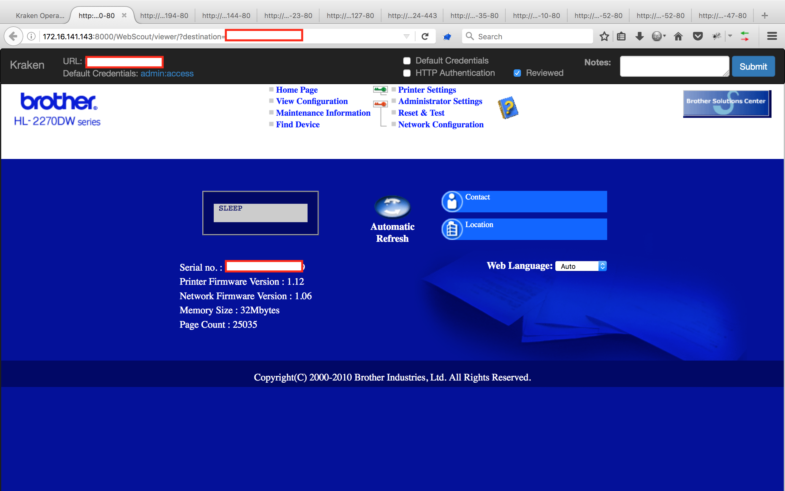 The second step here is slightly convoluted due to security controls in modern browsers when it comes to iframes. Fundamentally, you simply go through each interface, tab by tab, until you are back to just the Kraken interface. Each KrakenView tab will have a toolbar at the top. Here you can assess unencrypted web interfaces and take notes as needed. If the interface was identified by Kraken, possible default credentials will be displayed.
