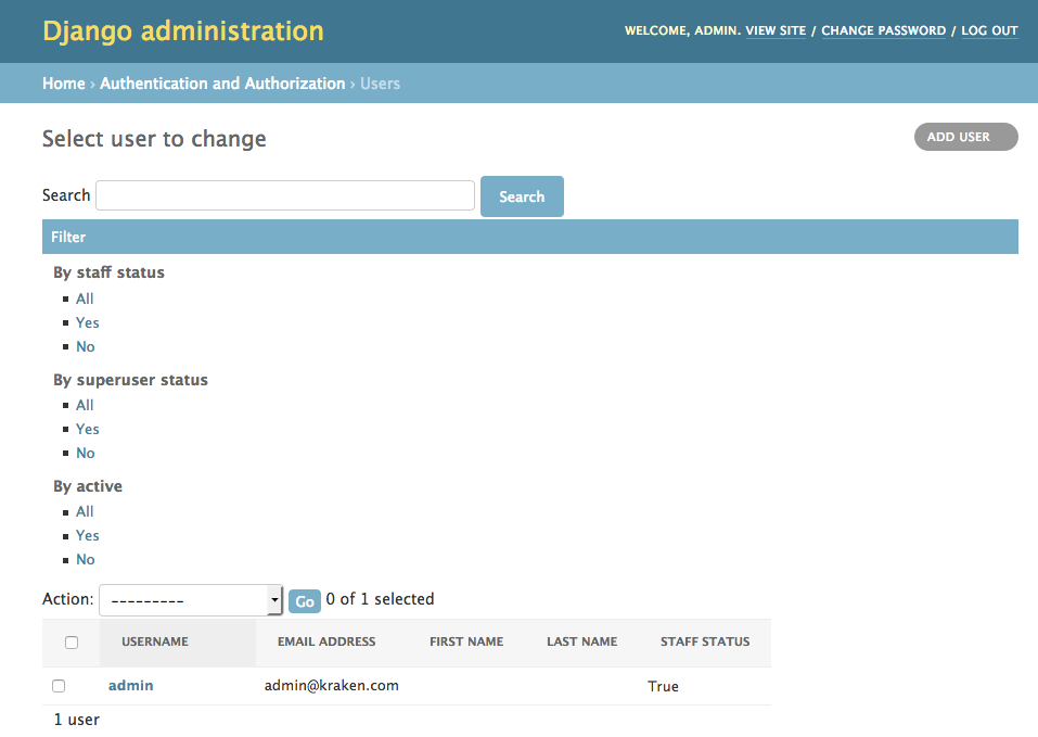 Add an admin user to Kraken with the Kraken utility. This is useful if you find yourself without a user to log into Kraken with for one reason or another. User management can also be performed at Django administration page if you already have a user account: