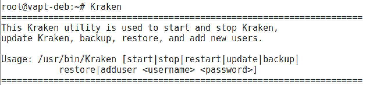 During installation, shell script named Kraken.sh is copied to /usr/bin. I refer to this as the Kraken utility going forward. The Kraken utility is used to perform several administrative tasks: