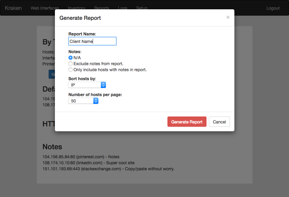 If you would like to generate a static HTML report, click the "Generate Report" button. A box will pop up with several options for formatting your report. The "Report Name" will be displayed in the report's header. You can exclude notes from the report, only include hosts that have notes entered in the report, and sort by different fields.