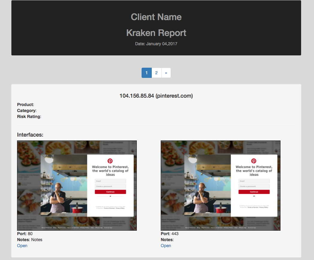 Once created, you will be served a zip file containing all of the screenshots and HTML source to view the report. The report is similar to the "Web Interfaces" page, hosts have their own containers down the page. A link is included for each interface as well.