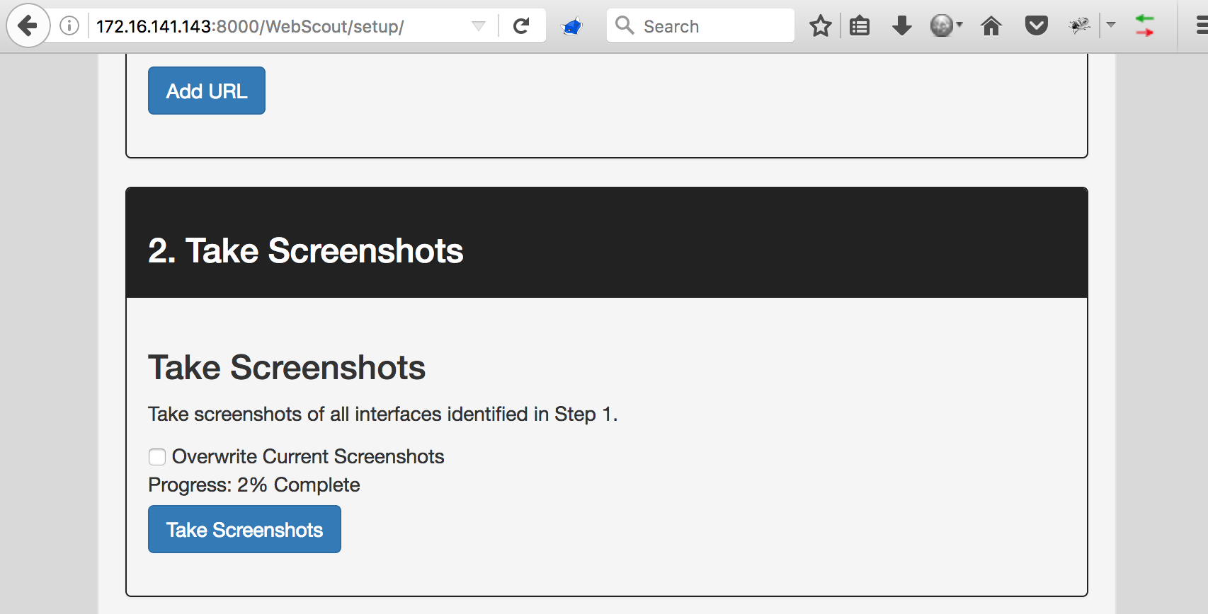 Step two is simple, take screenshots using the information in the database. By default, this will not overwrite screenshots that have been taken previously. There is a checkbox if you wish to do so. Progress will be tracked as a percentage on the Setup page, and can monitored in the Celery log at /var/log/celery/krakenworker.log.