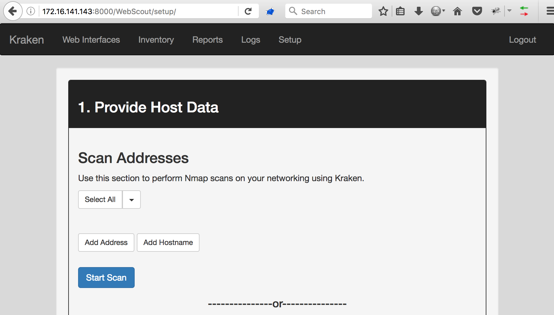 This functionality allows you to specify addresses to perform Nmap scans on. For 'Add Address', enter a line or space delimited list of addresses or CIDR address ranges. Individual addresses will have a /32 appended. 'Add Hostname' requires a line delimited list of hostnames. At this point, you must select what you want to scan and click 'Start Scan. This performs the following scan on each selected entry: