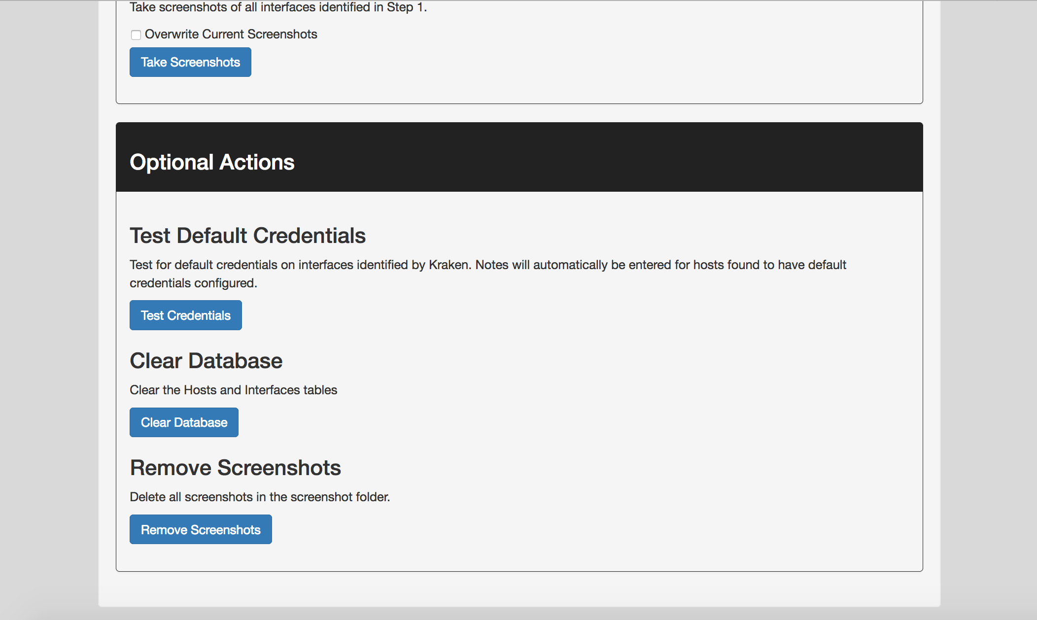 Delete all records in the Hosts and Interfaces tables. Addresses entered in Step 1 will not be deleted with this option, nor will screenshots taken by Kraken.