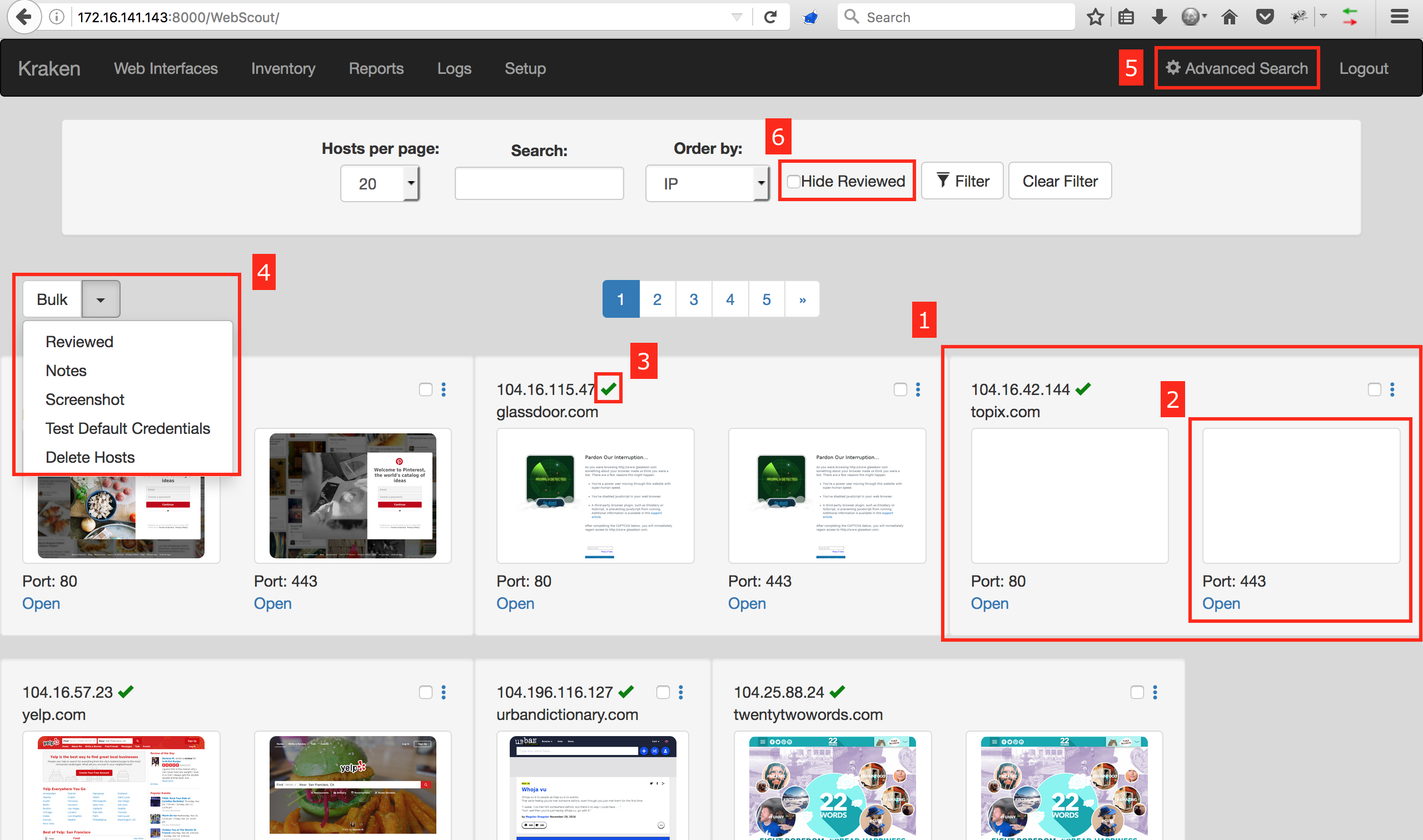 Advanced Search displays filtering options for changing the number of hosts displayed per page, searching, changing the order of hosts, and hiding reviewed hosts.