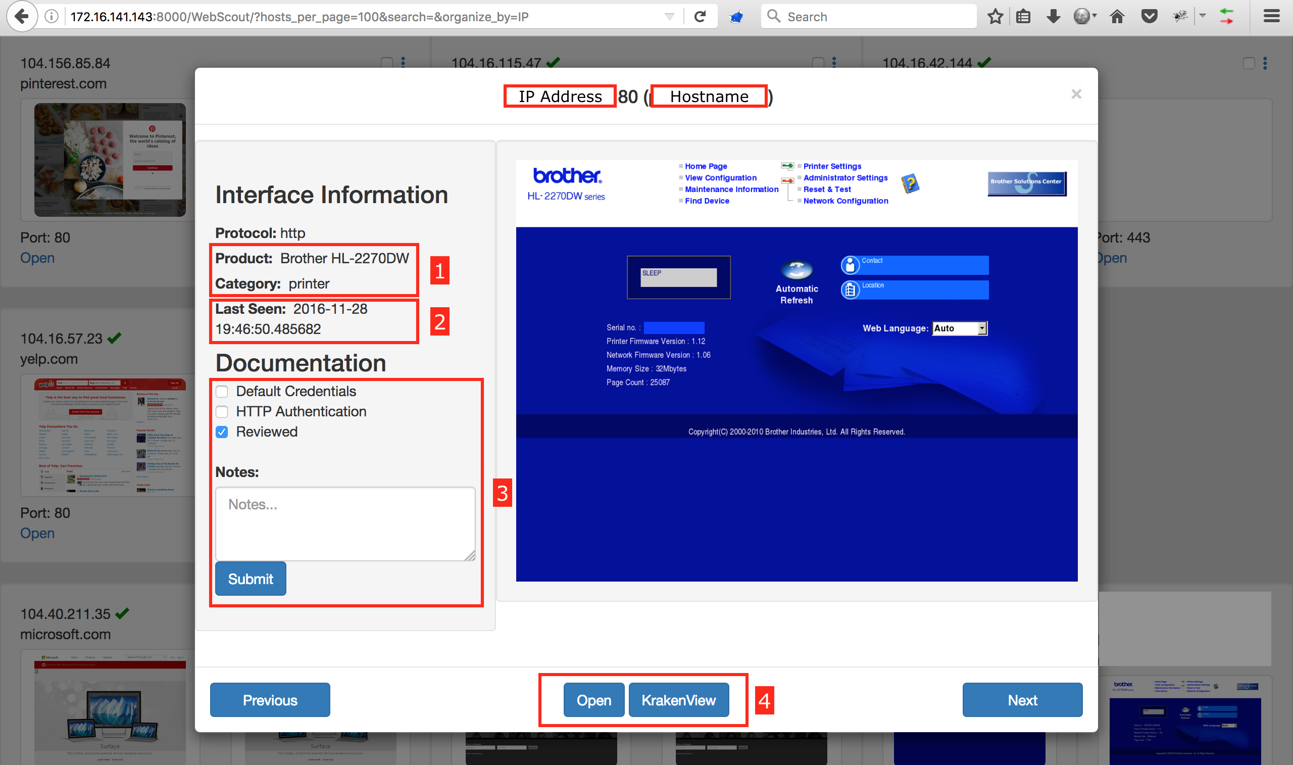 - There are two options for accessing the interface, both of which mark the host as 'Reviewed'. Open will go directly to the interface. KrakenView will open the interface in an iframe with a Kraken header at the top.